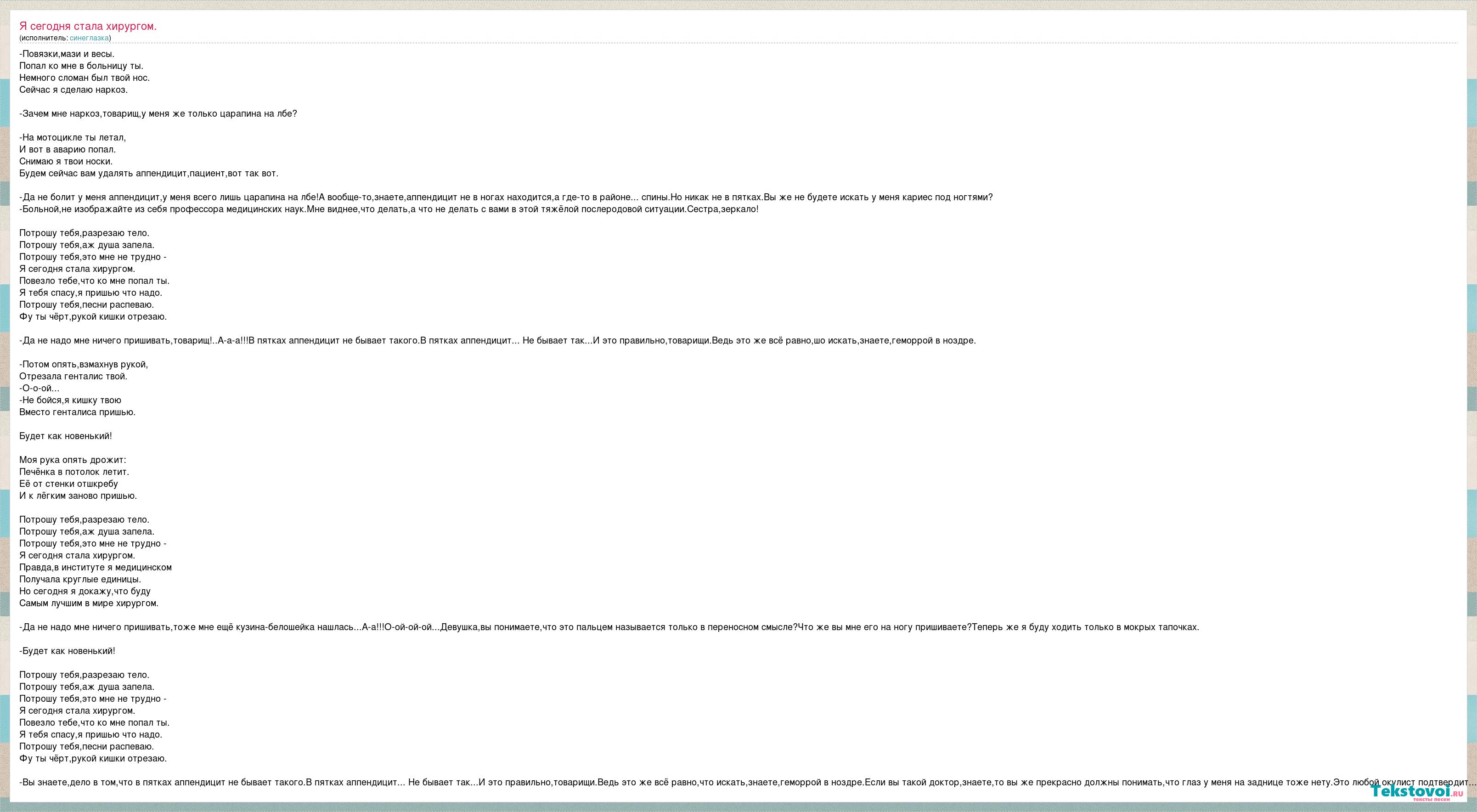 -Повязки,мази и весы. Попал ко мне в больницу ты. Немного сломан был твой нос. Сейчас я сделаю наркоз. -Зачем мне наркоз,товарищ,у меня же только царапина на лбе? -На мотоцикле ты летал, И вот в аварию попал. Снимаю я твои носки. Будем сейчас вам удалять аппендицит,пациент,вот так вот. -Да не болит у меня аппендицит,у меня всего лишь царапина на лбе!А вообще-то,знаете,аппендицит не в ногах находится,а где-то в районе... спины.Но никак не в пятках.Вы же не будете искать у меня кариес под ногтями? -Больной,не изображайте из себя профессора медицинских наук.Мне виднее,что делать,а что не делать с вами в этой тяжёлой послеродовой ситуации.Сестра,зеркало! Потрошу тебя,разрезаю тело. Потрошу тебя,аж душа запела. Потрошу тебя,это мне не трудно - Я сегодня стала хирургом. Повезло тебе,что ко мне попал ты. Я тебя спасу,я пришью что надо. Потрошу тебя,песни распеваю. Фу ты чёрт,рукой кишки отрезаю. -Да не надо мне ничего пришивать,товарищ!..А-а-а!!!В пятках аппендицит не бывает такого.В пятках аппендицит... Не бывает так...И это правильно,товарищи.Ведь это же всё равно,шо искать,знаете,геморрой в ноздре. -Потом опять,взмахнув рукой, Отрезала генталис твой. -О-о-ой... -Не бойся,я кишку твою Вместо генталиса пришью. Будет как новенький! Моя рука опять дрожит: Печёнка в потолок летит. Её от стенки отшкребу И к лёгким заново пришью. Потрошу тебя,разрезаю тело. Потрошу тебя,аж душа запела. Потрошу тебя,это мне не трудно - Я сегодня стала хирургом. Правда,в институте я медицинском Получала круглые единицы. Но сегодня я докажу,что буду Самым лучшим в мире хирургом. -Да не надо мне ничего пришивать,тоже мне ещё кузина-белошейка нашлась...А-а!!!О-ой-ой-ой...Девушка,вы понимаете,что это пальцем называется только в переносном смысле?Что же вы мне его на ногу пришиваете?Теперь же я буду ходить только в мокрых тапочках. -Будет как новенький! Потрошу тебя,разрезаю тело. Потрошу тебя,аж душа запела. Потрошу тебя,это мне не трудно - Я сегодня стала хирургом. Повезло тебе,что ко мне попал ты. Я тебя спасу,я пришью что надо. Потрошу тебя,песни распеваю. Фу ты чёрт,рукой кишки отрезаю. -Вы знаете,дело в том,что в пятках аппендицит не бывает такого.В пятках аппендицит... Не бывает так...И это правильно,товарищи.Ведь это же всё равно,что искать,знаете,геморрой в ноздре.Если вы такой доктор,знаете,то вы же прекрасно должны понимать,что глаз у меня на заднице тоже нету.Это любой окулист подтвердит...