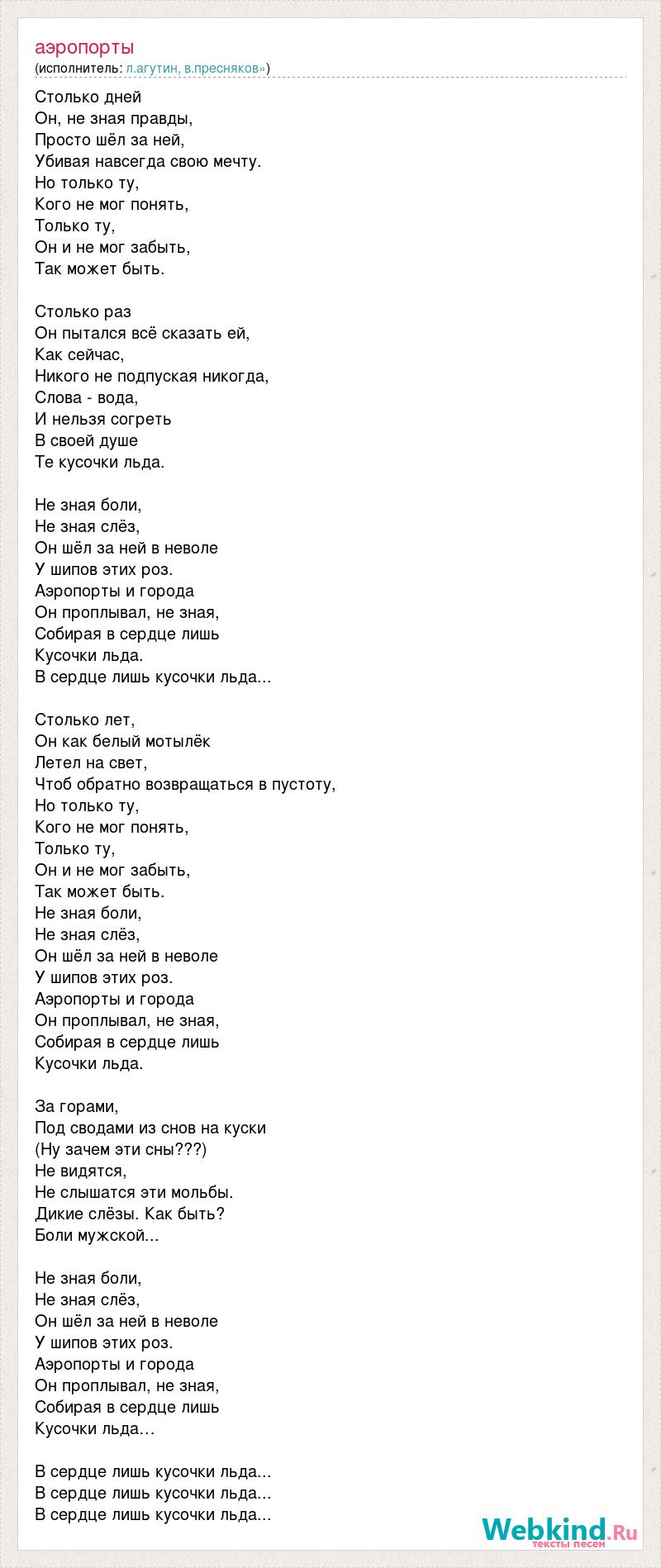 Столько дней Он, не зная правды, Просто шёл за ней, Убивая навсегда свою мечту. Но только ту, Кого не мог понять, Только ту, Он и не мог забыть, Так может быть. Столько раз Он пытался всё сказать ей, Как сейчас, Никого не подпуская никогда, Слова - вода, И нельзя согреть В своей душе Те кусочки льда. Не зная боли, Не зная слёз, Он шёл за ней в неволе У шипов этих роз. Аэропорты и города Он проплывал, не зная, Собирая в сердце лишь Кусочки льда. В сердце лишь кусочки льда... Столько лет, Он как белый мотылёк Летел на свет, Чтоб обратно возвращаться в пустоту, Но только ту, Кого не мог понять, Только ту, Он и не мог забыть, Так может быть. Не зная боли, Не зная слёз, Он шёл за ней в неволе У шипов этих роз. Аэропорты и города Он проплывал, не зная, Собирая в сердце лишь Кусочки льда. За горами, Под сводами из снов на куски (Ну зачем эти сны???) Не видятся, Не слышатся эти мольбы. Дикие слёзы. Как быть? Боли мужской... Не зная боли, Не зная слёз, Он шёл за ней в неволе У шипов этих роз. Аэропорты и города Он проплывал, не зная, Собирая в сердце лишь Кусочки льда… В сердце лишь кусочки льда... В сердце лишь кусочки льда... В сердце лишь кусочки льда...