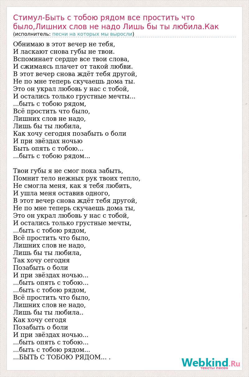 Обнимаю в этот вечер не тебя, И ласкают снова губы не твои. Вспоминает сердце все твои слова, И сжимаясь плачет от такой любви. В этот вечер снова ждёт тебя другой, Не по мне теперь скучаешь дома ты. Это он украл любовь у нас с тобой, И остались только грустные мечты... ...быть с тобою рядом, Всё простить что было, Лишних слов не надо, Лишь бы ты любила, Как хочу сегодня позабыть о боли И при звёздах ночью Быть опять с тобою... ...быть с тобою рядом... Твои губы я не смог пока забыть, Помнит тело нежных рук твоих тепло, Не смогла меня, как я тебя любить, И ушла меня оставив одного, В этот вечер снова ждёт тебя другой, Не по мне теперь скучаешь дома ты, Это он украл любовь у нас с тобой, И остались только грустные мечты, ...быть с тобою рядом, Всё простить что было, Лишних слов не надо, Лишь бы ты любила, Так хочу сегодня Позабыть о боли И при звёздах ночью... ...быть опять с тобою... ...быть с тобою рядом, Всё простить что было, Лишних слов не надо, Лишь бы ты любила.. Как хочу сегодя Позабыть о боли И при звёздах ночью... ...быть опять с тобою... ...быть с тобою рядом... ...БЫТЬ С ТОБОЮ РЯДОМ... .