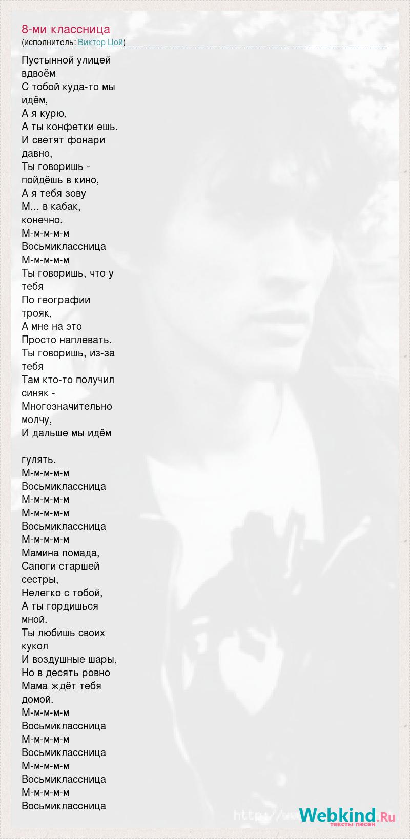 Пустынной улицей вдвоём С тобой куда-то мы идём, А я курю, А ты конфетки ешь. И светят фонари давно, Ты говоришь - пойдёшь в кино, А я тебя зову М... в кабак, конечно. М-м-м-м-м Восьмиклассница М-м-м-м-м Ты говоришь, что у тебя По географии трояк, А мне на это Просто наплевать. Ты говоришь, из-за тебя Там кто-то получил синяк - Многозначительно молчу, И дальше мы идём гулять. М-м-м-м-м Восьмиклассница М-м-м-м-м М-м-м-м-м Восьмиклассница М-м-м-м-м Мамина помада, Сапоги старшей сестры, Нелегко с тобой, А ты гордишься мной. Ты любишь своих кукол И воздушные шары, Но в десять ровно Мама ждёт тебя домой. М-м-м-м-м Восьмиклассница М-м-м-м-м Восьмиклассница М-м-м-м-м Восьмиклассница М-м-м-м-м Восьмиклассница