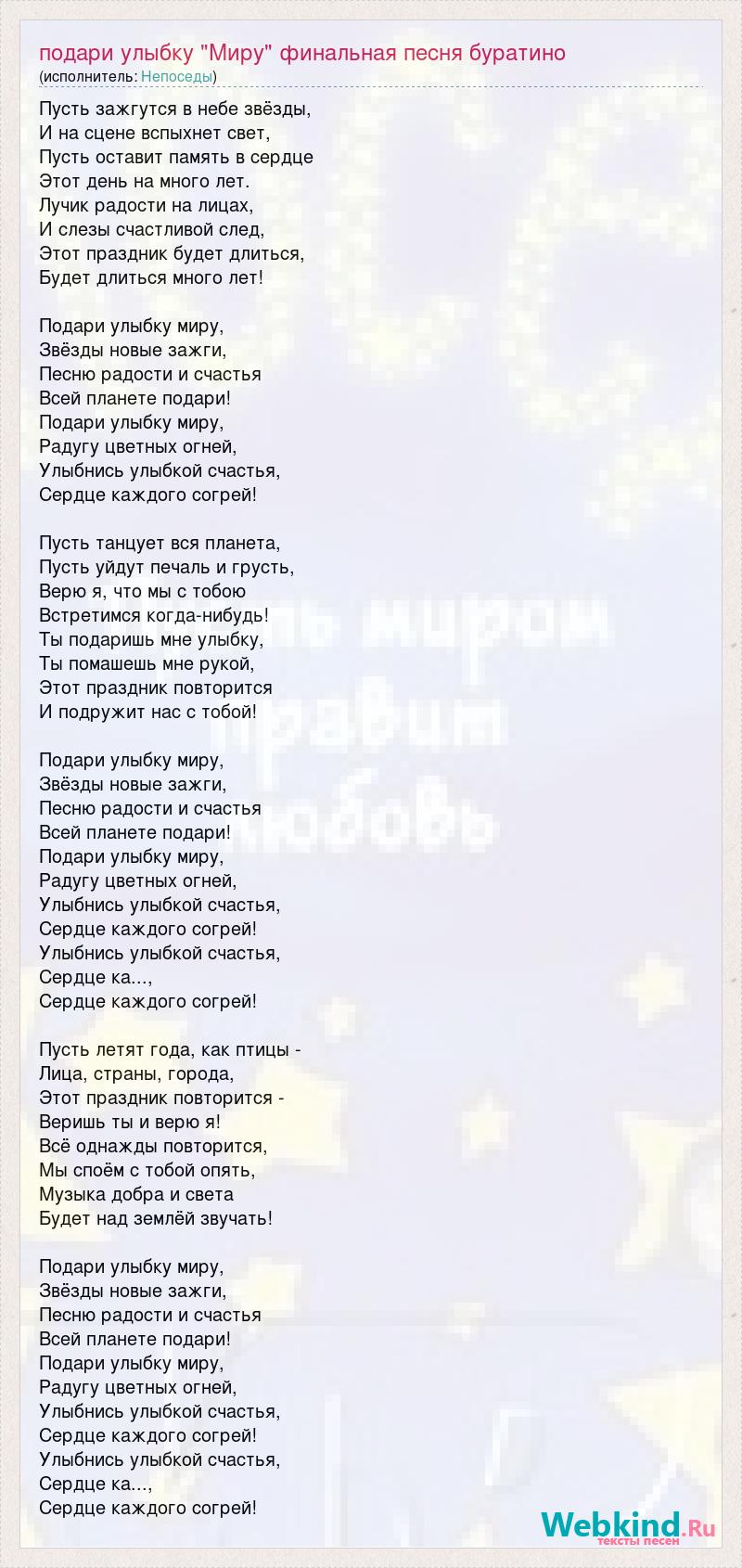 Пусть зажгутся в небе звёзды, И на сцене вспыхнет свет, Пусть оставит память в сердце Этот день на много лет. Лучик радости на лицах, И слезы счастливой след, Этот праздник будет длиться, Будет длиться много лет! Подари улыбку миру, Звёзды новые зажги, Песню радости и счастья Всей планете подари! Подари улыбку миру, Радугу цветных огней, Улыбнись улыбкой счастья, Сердце каждого согрей! Пусть танцует вся планета, Пусть уйдут печаль и грусть, Верю я, что мы с тобою Встретимся когда-нибудь! Ты подаришь мне улыбку, Ты помашешь мне рукой, Этот праздник повторится И подружит нас с тобой! Подари улыбку миру, Звёзды новые зажги, Песню радости и счастья Всей планете подари! Подари улыбку миру, Радугу цветных огней, Улыбнись улыбкой счастья, Сердце каждого согрей! Улыбнись улыбкой счастья, Сердце ка..., Сердце каждого согрей! Пусть летят года, как птицы - Лица, страны, города, Этот праздник повторится - Веришь ты и верю я! Всё однажды повторится, Мы споём с тобой опять, Музыка добра и света Будет над землёй звучать! Подари улыбку миру, Звёзды новые зажги, Песню радости и счастья Всей планете подари! Подари улыбку миру, Радугу цветных огней, Улыбнись улыбкой счастья, Сердце каждого согрей! Улыбнись улыбкой счастья, Сердце ка..., Сердце каждого согрей!