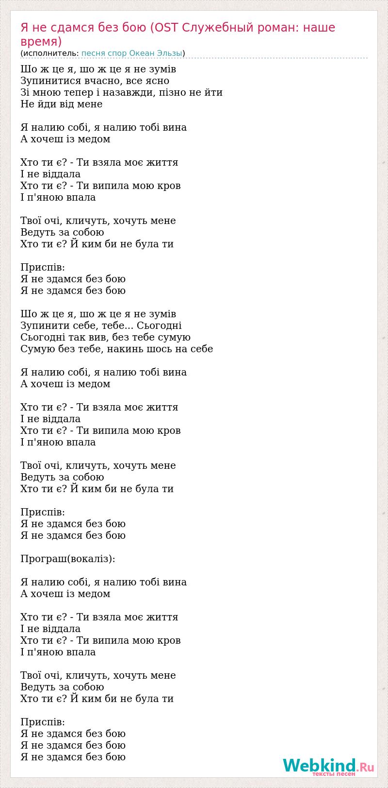 Шо ж це я, шо ж це я не зумів Зупинитися вчасно, все ясно Зі мною тепер і назавжди, пізно не йти Не йди від мене Я налию собі, я налию тобі вина А хочеш із медом Хто ти є? - Ти взяла моє життя І не віддала Хто ти є? - Ти випила мою кров І п'яною впала Твої очі, кличуть, хочуть мене Ведуть за собою Хто ти є? Й ким би не була ти Приспів: Я не здамся без бою Я не здамся без бою Шо ж це я, шо ж це я не зумів Зупинити себе, тебе... Сьогодні Сьогодні так вив, без тебе сумую Сумую без тебе, накинь шось на себе Я налию собі, я налию тобі вина А хочеш із медом Хто ти є? - Ти взяла моє життя І не віддала Хто ти є? - Ти випила мою кров І п'яною впала Твої очі, кличуть, хочуть мене Ведуть за собою Хто ти є? Й ким би не була ти Приспів: Я не здамся без бою Я не здамся без бою Програш(вокаліз): Я налию собі, я налию тобі вина А хочеш із медом Хто ти є? - Ти взяла моє життя І не віддала Хто ти є? - Ти випила мою кров І п'яною впала Твої очі, кличуть, хочуть мене Ведуть за собою Хто ти є? Й ким би не була ти Приспів: Я не здамся без бою Я не здамся без бою Я не здамся без бою