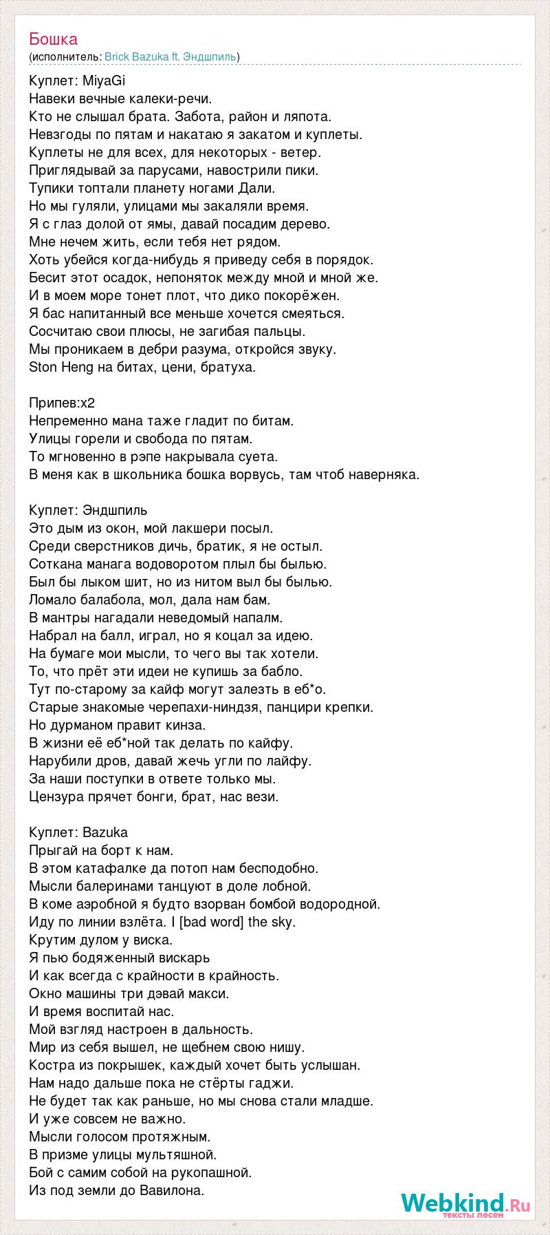 Куплет: MiyaGi Навеки вечные калеки-речи. Кто не слышал брата. Забота, район и ляпота. Невзгоды по пятам и накатаю я закатом и куплеты. Куплеты не для всех, для некоторых - ветер. Приглядывай за парусами, навострили пики. Тупики топтали планету ногами Дали. Но мы гуляли, улицами мы закаляли время. Я с глаз долой от ямы, давай посадим дерево. Мне нечем жить, если тебя нет рядом. Хоть убейся когда-нибудь я приведу себя в порядок. Бесит этот осадок, непоняток между мной и мной же. И в моем море тонет плот, что дико покорёжен. Я бас напитанный все меньше хочется смеяться. Сосчитаю свои плюсы, не загибая пальцы. Мы проникаем в дебри разума, откройся звуку. Ston Heng на битах, цени, братуха. Припев:х2 Непременно мана таже гладит по битам. Улицы горели и свобода по пятам. То мгновенно в рэпе накрывала суета. В меня как в школьника бошка ворвусь, там чтоб наверняка. Куплет: Эндшпиль Это дым из окон, мой лакшери посыл. Среди сверстников дичь, братик, я не остыл. Соткана манага водоворотом плыл бы былью. Был бы лыком шит, но из нитом выл бы былью. Ломало балабола, мол, дала нам бам. В мантры нагадали неведомый напалм. Набрал на балл, играл, но я коцал за идею. На бумаге мои мысли, то чего вы так хотели. То, что прёт эти идеи не купишь за бабло. Тут по-старому за кайф могут залезть в еб*о. Старые знакомые черепахи-ниндзя, панцири крепки. Но дурманом правит кинза. В жизни её еб*ной так делать по кайфу. Нарубили дров, давай жечь угли по лайфу. За наши поступки в ответе только мы. Цензура прячет бонги, брат, нас вези. Куплет: Bazuka Прыгай на борт к нам. В этом катафалке да потоп нам бесподобно. Мысли балеринами танцуют в доле лобной. В коме аэробной я будто взорван бомбой водородной. Иду по линии взлёта. I [bad word] the sky. Крутим дулом у виска. Я пью бодяженный вискарь И как всегда с крайности в крайность. Окно машины три дэвай макси. И время воспитай нас. Мой взгляд настроен в дальность. Мир из себя вышел, не щебнем свою нишу. Костра из покрышек, каждый хочет быть услышан. Нам надо дальше пока не стёрты гаджи. Не будет так как раньше, но мы снова стали младше. И уже совсем не важно. Мысли голосом протяжным. В призме улицы мультяшной. Бой с самим собой на рукопашной. Из под земли до Вавилона.