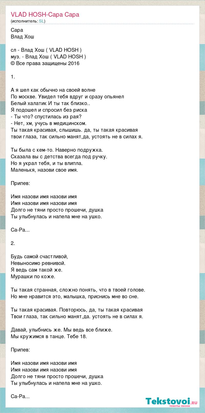 Сара Влад Хош сл - Влад Хош ( VLAD HOSH ) муз. - Влад Хош ( VLAD HOSH ) © Все права защищены 2016 1. А я шел как обычно на своей волне По москве. Увидел тебя вдруг и сразу опьянел Белый халатик И ты так близко.. Я подошел и спросил без риска - Ты что? спустилась из рая? - Нет, хм, учусь в медицинском. Ты такая красивая, слышишь. да, ты такая красивая твои глаза, так сильно манят,да, устоять не в силах я. Ты была с кем-то. Наверно подружка. Сказала вы с детства всегда под ручку. Но я украл тебя, и ты влипла. Маленькя, назови свое имя. Припев: Имя назови имя назови имя Имя назови имя назови имя Долго не тяни просто прошечи, душка Ты улыбнулась и напела мне на ушко. Са-Ра... 2. Будь самой счастливой, Невыносимо ревнивой. Я ведь сам такой же. Мурашки по коже. Ты такая странная, сложно понять, что в твоей голове. Но мне нравится это, малышка, приснись мне во сне. Ты такая красивая. Повторюсь, да, ты такая красивая Твои глаза, так сильно манят,да. устоять не в силах я. Давай, улыбнись же. Мы ведь все ближе. Мы кружимся в танце. Тебе 18. Припев: Имя назови имя назови имя Имя назови имя назови имя Долго не тяни просто прошечи, душка Ты улыбнулась и напела мне на ушко. Са-Ра...