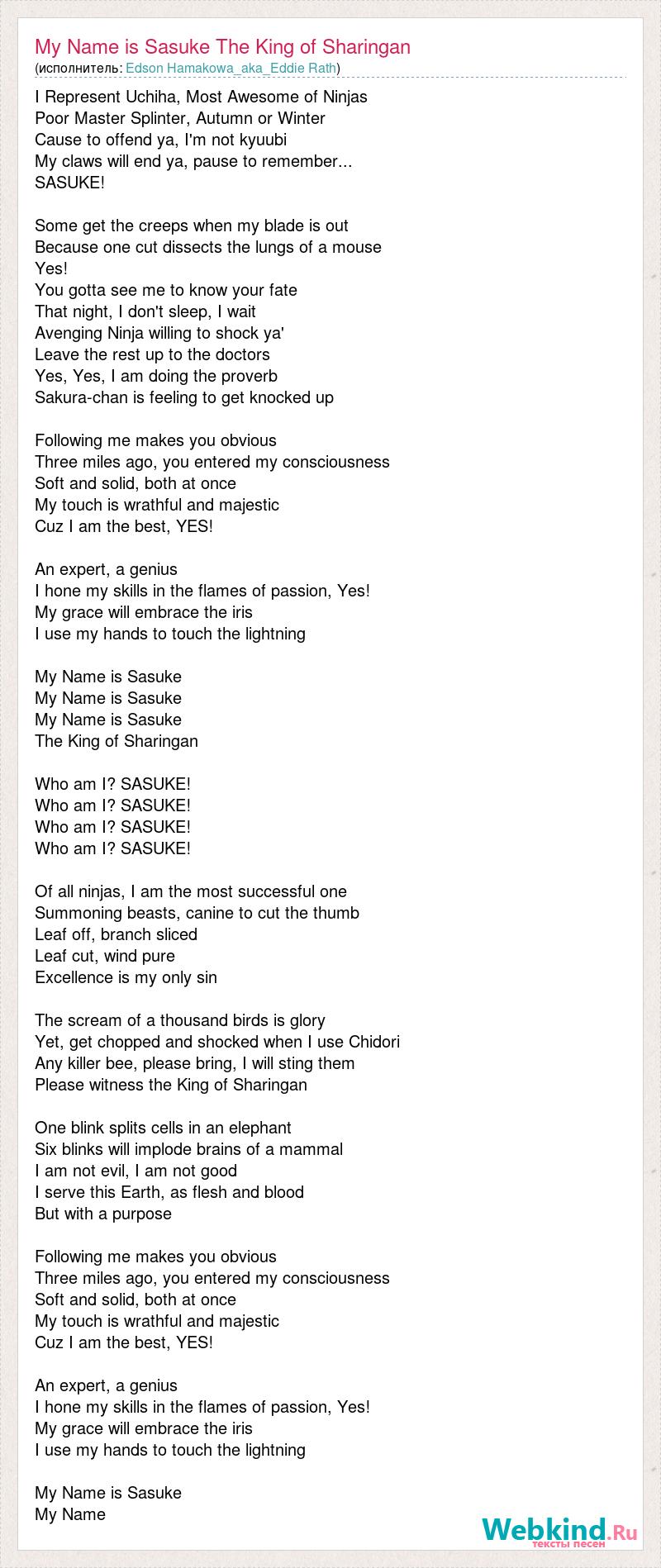 I Represent Uchiha, Most Awesome of Ninjas Poor Master Splinter, Autumn or Winter Cause to offend ya, I'm not kyuubi My claws will end ya, pause to remember... SASUKE! Some get the creeps when my blade is out Because one cut dissects the lungs of a mouse Yes! You gotta see me to know your fate That night, I don't sleep, I wait Avenging Ninja willing to shock ya' Leave the rest up to the doctors Yes, Yes, I am doing the proverb Sakura-chan is feeling to get knocked up Following me makes you obvious Three miles ago, you entered my consciousness Soft and solid, both at once My touch is wrathful and majestic Cuz I am the best, YES! An expert, a genius I hone my skills in the flames of passion, Yes! My grace will embrace the iris I use my hands to touch the lightning My Name is Sasuke My Name is Sasuke My Name is Sasuke The King of Sharingan Who am I? SASUKE! Who am I? SASUKE! Who am I? SASUKE! Who am I? SASUKE! Of all ninjas, I am the most successful one Summoning beasts, canine to cut the thumb Leaf off, branch sliced Leaf cut, wind pure Excellence is my only sin The scream of a thousand birds is glory Yet, get chopped and shocked when I use Chidori Any killer bee, please bring, I will sting them Please witness the King of Sharingan One blink splits cells in an elephant Six blinks will implode brains of a mammal I am not evil, I am not good I serve this Earth, as flesh and blood But with a purpose Following me makes you obvious Three miles ago, you entered my consciousness Soft and solid, both at once My touch is wrathful and majestic Cuz I am the best, YES! An expert, a genius I hone my skills in the flames of passion, Yes! My grace will embrace the iris I use my hands to touch the lightning My Name is Sasuke My Name