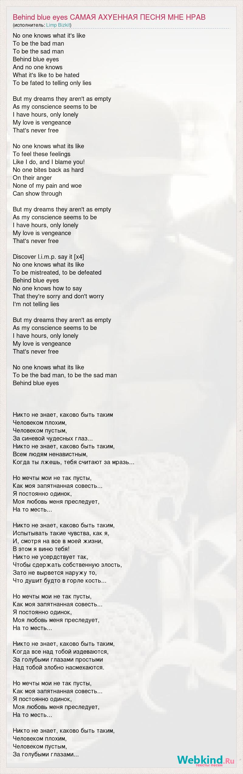 No one knows what it's like To be the bad man To be the sad man Behind blue eyes And no one knows What it's like to be hated To be fated to telling only lies But my dreams they aren't as empty As my conscience seems to be I have hours, only lonely My love is vengeance That's never free No one knows what its like To feel these feelings Like I do, and I blame you! No one bites back as hard On their anger None of my pain and woe Can show through But my dreams they aren't as empty As my conscience seems to be I have hours, only lonely My love is vengeance That's never free Discover l.i.m.p. say it [x4] No one knows what its like To be mistreated, to be defeated Behind blue eyes No one knows how to say That they're sorry and don't worry I'm not telling lies But my dreams they aren't as empty As my conscience seems to be I have hours, only lonely My love is vengeance That's never free No one knows what its like To be the bad man, to be the sad man Behind blue eyes Никто не знает, каково быть таким Человеком плохим, Человеком пустым, За синевой чудесных глаз... Никто не знает, каково быть таким, Всем людям ненавистным, Когда ты лжешь, тебя считают за мразь... Но мечты мои не так пусты, Как моя запятнанная совесть... Я постоянно одинок, Моя любовь меня преследует, На то месть... Никто не знает, каково быть таким, Испытывать такие чувства, как я, И, смотря на все в моей жизни, В этом я виню тебя! Никто не усердствует так, Чтобы сдержать собственную злость, Зато не вырвется наружу то, Что душит будто в горле кость... Но мечты мои не так пусты, Как моя запятнанная совесть... Я постоянно одинок, Моя любовь меня преследует, На то месть... Никто не знает, каково быть таким, Когда все над тобой издеваются, За голубыми глазами простыми Над тобой злобно насмехаются. Но мечты мои не так пусты, Как моя запятнанная совесть... Я постоянно одинок, Моя любовь меня преследует, На то месть... Никто не знает, каково быть таким, Человеком плохим, Человеком пустым, За голубыми глазами...