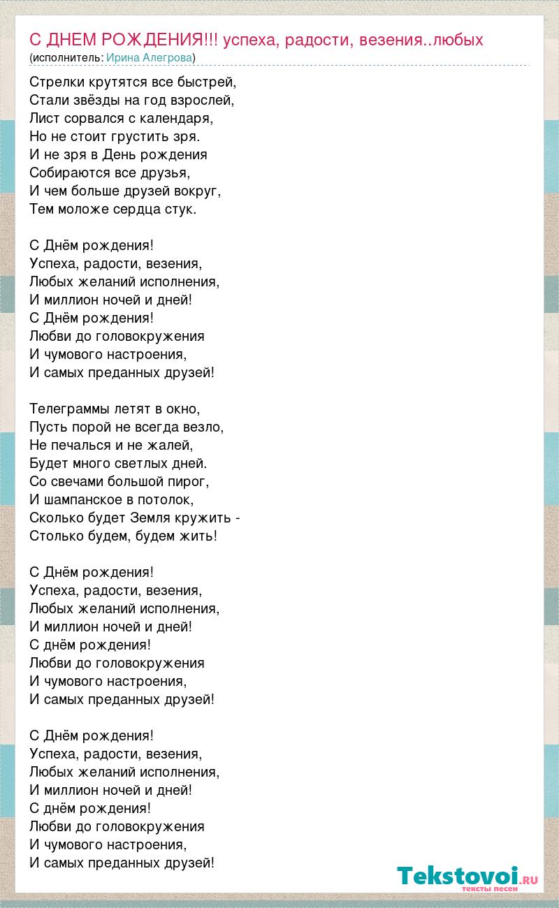 Стрелки крутятся все быстрей, Стали звёзды на год взрослей, Лист сорвался с календаря, Но не стоит грустить зря. И не зря в День рождения Собираются все друзья, И чем больше друзей вокруг, Тем моложе сердца стук. С Днём рождения! Успеха, радости, везения, Любых желаний исполнения, И миллион ночей и дней! С Днём рождения! Любви до головокружения И чумового настроения, И самых преданных друзей! Телеграммы летят в окно, Пусть порой не всегда везло, Не печалься и не жалей, Будет много светлых дней. Со свечами большой пирог, И шампанское в потолок, Сколько будет Земля кружить - Столько будем, будем жить! С Днём рождения! Успеха, радости, везения, Любых желаний исполнения, И миллион ночей и дней! С днём рождения! Любви до головокружения И чумового настроения, И самых преданных друзей! С Днём рождения! Успеха, радости, везения, Любых желаний исполнения, И миллион ночей и дней! С днём рождения! Любви до головокружения И чумового настроения, И самых преданных друзей!