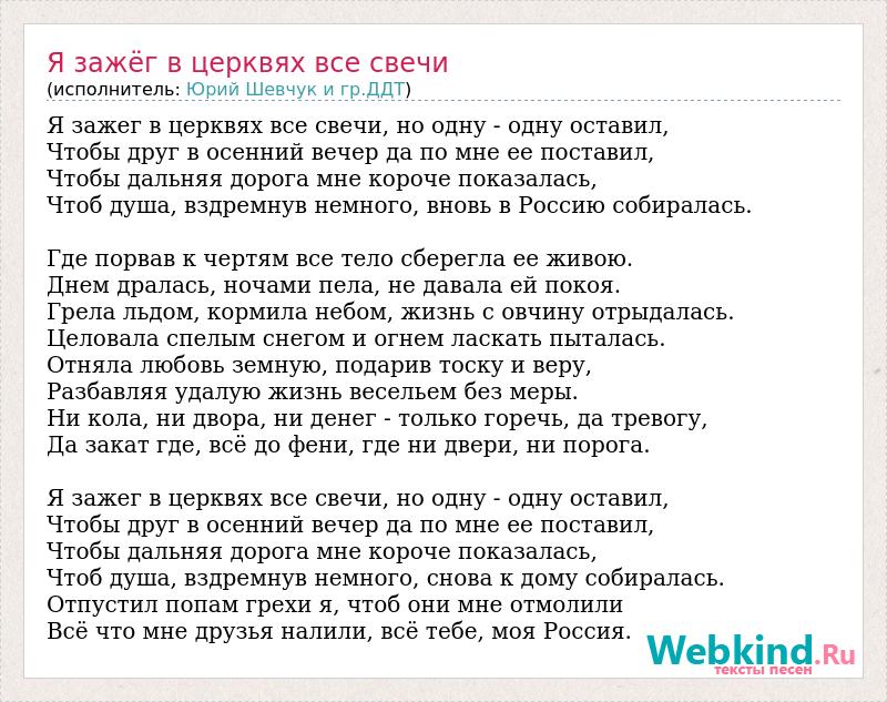 Я зажег в церквях все свечи, но одну - одну оставил, Чтобы друг в осенний вечер да по мне ее поставил, Чтобы дальняя дорога мне короче показалась, Чтоб душа, вздремнув немного, вновь в Россию собиралась. Где порвав к чертям все тело сберегла ее живою. Днем дралась, ночами пела, не давала ей покоя. Грела льдом, кормила небом, жизнь с овчину отрыдалась. Целовала спелым снегом и огнем ласкать пыталась. Отняла любовь земную, подарив тоску и веру, Разбавляя удалую жизнь весельем без меры. Ни кола, ни двора, ни денег - только горечь, да тревогу, Да закат где, всё до фени, где ни двери, ни порога. Я зажег в церквях все свечи, но одну - одну оставил, Чтобы друг в осенний вечер да по мне ее поставил, Чтобы дальняя дорога мне короче показалась, Чтоб душа, вздремнув немного, снова к дому собиралась. Отпустил попам грехи я, чтоб они мне отмолили Всё что мне друзья налили, всё тебе, моя Россия.