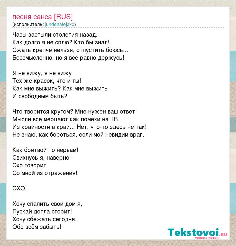 Часы застыли столетия назад. Как долго я не сплю? Кто бы знал! Сжать крепче нельзя, отпустить боюсь... Бессмысленно, но я все равно держусь! Я не вижу, я не вижу Тех же красок, что и ты! Как мне выжить? Как мне выжить И свободным быть? Что творится кругом? Мне нужен ваш ответ! Мысли все мерцают как помехи на ТВ. Из крайности в край... Нет, что-то здесь не так! Не знаю, как бороться, если мой невидим враг. Как бритвой по нервам! Свихнусь я, наверно - Эхо говорит Со мной из отражения! ЭХО! Хочу спалить свой дом я, Пускай дотла сгорит! Хочу сбежать сегодня, Обо всём забыть!