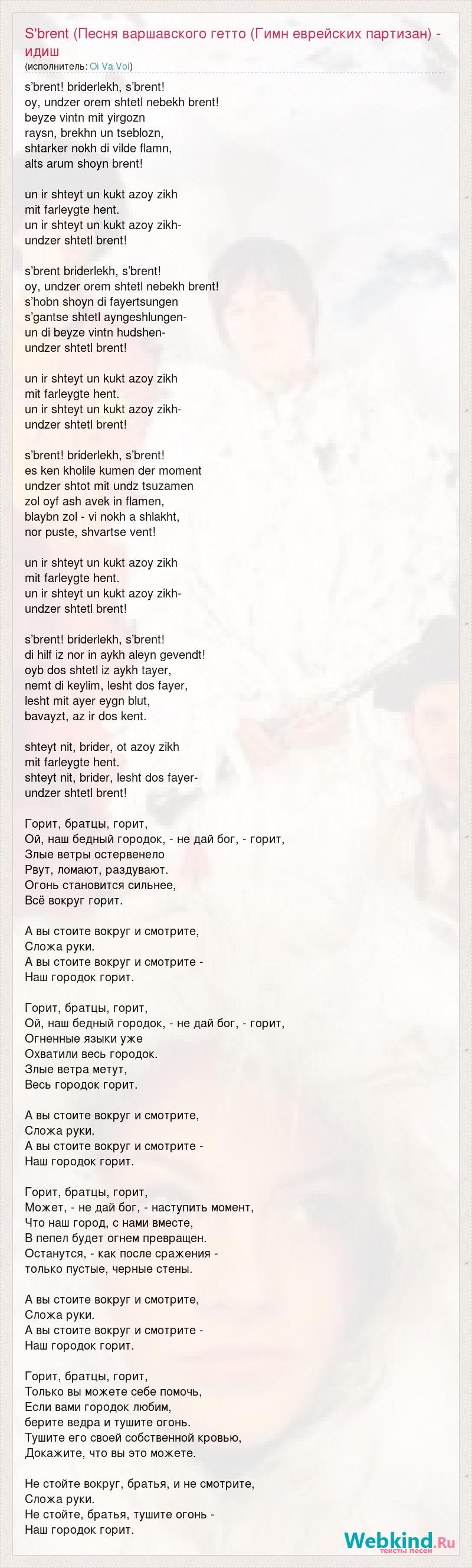 s’brent! briderlekh, s’brent! oy, undzer orem shtetl nebekh brent! beyze vintn mit yirgozn raysn, brekhn un tseblozn, shtarker nokh di vilde flamn, alts arum shoyn brent! un ir shteyt un kukt azoy zikh mit farleygte hent. un ir shteyt un kukt azoy zikh- undzer shtetl brent! s’brent briderlekh, s’brent! oy, undzer orem shtetl nebekh brent! s’hobn shoyn di fayertsungen s’gantse shtetl ayngeshlungen- un di beyze vintn hudshen- undzer shtetl brent! un ir shteyt un kukt azoy zikh mit farleygte hent. un ir shteyt un kukt azoy zikh- undzer shtetl brent! s’brent! briderlekh, s’brent! es ken kholile kumen der moment undzer shtot mit undz tsuzamen zol oyf ash avek in flamen, blaybn zol - vi nokh a shlakht, nor puste, shvartse vent! un ir shteyt un kukt azoy zikh mit farleygte hent. un ir shteyt un kukt azoy zikh- undzer shtetl brent! s’brent! briderlekh, s’brent! di hilf iz nor in aykh aleyn gevendt! oyb dos shtetl iz aykh tayer, nemt di keylim, lesht dos fayer, lesht mit ayer eygn blut, bavayzt, az ir dos kent. shteyt nit, brider, ot azoy zikh mit farleygte hent. shteyt nit, brider, lesht dos fayer- undzer shtetl brent! Горит, братцы, горит, Ой, наш бедный городок, - не дай бог, - горит, Злые ветры остервенело Рвут, ломают, раздувают. Огонь становится сильнее, Всё вокруг горит. А вы стоите вокруг и смотрите, Сложа руки. А вы стоите вокруг и смотрите - Наш городок горит. Горит, братцы, горит, Ой, наш бедный городок, - не дай бог, - горит, Огненные языки уже Охватили весь городок. Злые ветра метут, Весь городок горит. А вы стоите вокруг и смотрите, Сложа руки. А вы стоите вокруг и смотрите - Наш городок горит. Горит, братцы, горит, Может, - не дай бог, - наступить момент, Что наш город, с нами вместе, В пепел будет огнем превращен. Останутся, - как после сражения - только пустые, черные стены. А вы стоите вокруг и смотрите, Сложа руки. А вы стоите вокруг и смотрите - Наш городок горит. Горит, братцы, горит, Только вы можете себе помочь, Если вами городок любим, берите ведра и тушите огонь. Тушите его своей собственной кровью, Докажите, что вы это можете. Не стойте вокруг, братья, и не смотрите, Сложа руки. Не стойте, братья, тушите огонь - Наш городок горит.