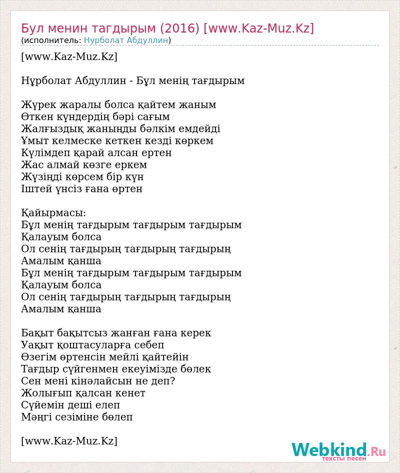 [www.Kaz-Muz.Kz] Нұрболат Абдуллин - Бұл менің тағдырым Жүрек жаралы болса қайтем жаным Өткен күндердің бәрі сағым Жалғыздық жаныңды бәлкім емдейді Ұмыт келмеске кеткен кезді көркем Күлімдеп қарай алсан ертен Жас алмай көзге еркем Жүзіңді көрсем бір күн Іштей үнсіз ғана өртен Қайырмасы: Бұл менің тағдырым тағдырым тағдырым Қалауым болса Ол сенің тағдырың тағдырың тағдырың Амалым қанша Бұл менің тағдырым тағдырым тағдырым Қалауым болса Ол сенің тағдырың тағдырың тағдырың Амалым қанша Бақыт бақытсыз жанған ғана керек Уақыт қоштасуларға себеп Өзегім өртенсін мейлі қайтейін Тағдыр сүйгенмен екеуімізде бөлек Сен мені кінәлайсын не деп? Жолығып қалсан кенет Сүйемін деші елеп Мәңгі сезіміне бөлеп [www.Kaz-Muz.Kz]
