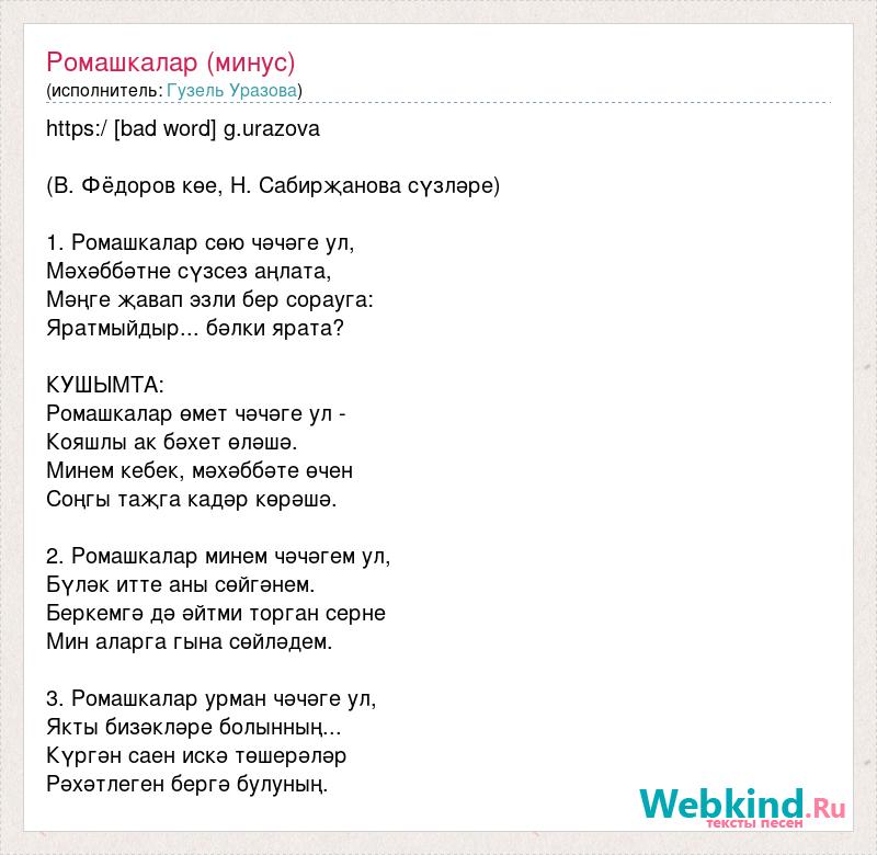 https:/ [bad word] g.urazova (В. Фёдоров көе, Н. Сабирҗанова сүзләре) 1. Ромашкалар сөю чәчәге ул, Мәхәббәтне сүзсез аңлата, Мәңге җавап эзли бер сорауга: Яратмыйдыр... бәлки ярата? КУШЫМТА: Ромашкалар өмет чәчәге ул - Кояшлы ак бәхет өләшә. Минем кебек, мәхәббәте өчен Соңгы таҗга кадәр көрәшә. 2. Ромашкалар минем чәчәгем ул, Бүләк итте аны сөйгәнем. Беркемгә дә әйтми торган серне Мин аларга гына сөйләдем. 3. Ромашкалар урман чәчәге ул, Якты бизәкләре болынның... Күргән саен искә төшерәләр Рәхәтлеген бергә булуның.