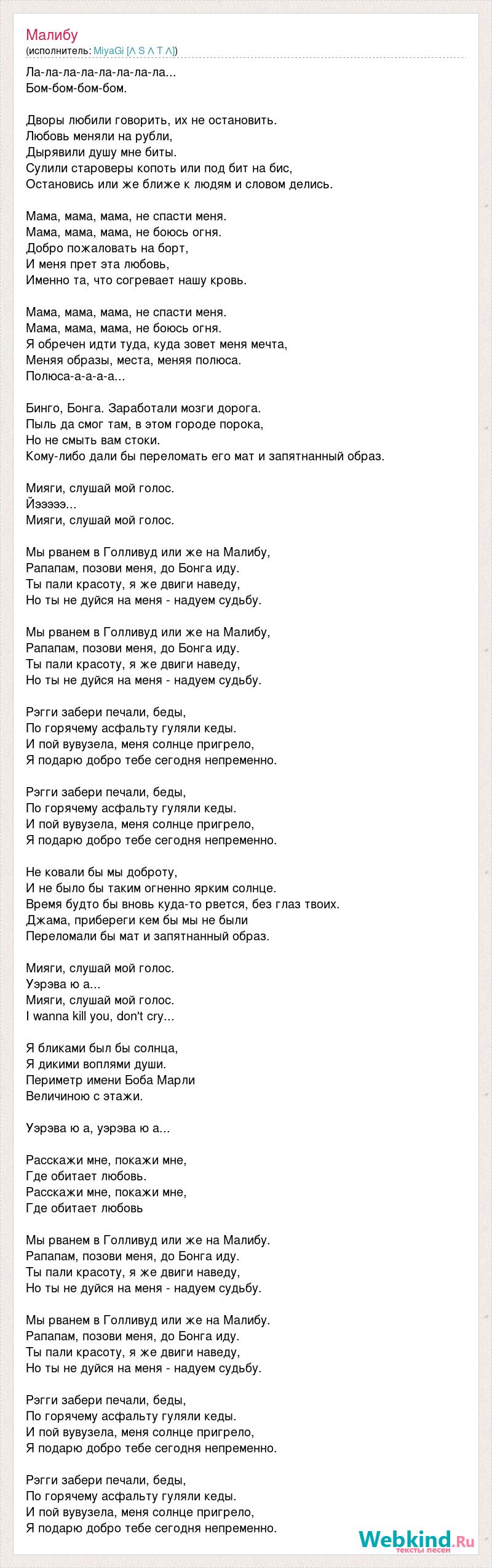 Ла-ла-ла-ла-ла-ла-ла-ла... Бом-бом-бом-бом. Дворы любили говорить, их не остановить. Любовь меняли на рубли, Дырявили душу мне биты. Сулили староверы копоть или под бит на бис, Остановись или же ближе к людям и словом делись. Мама, мама, мама, не спасти меня. Мама, мама, мама, не боюсь огня. Добро пожаловать на борт, И меня прет эта любовь, Именно та, что согревает нашу кровь. Мама, мама, мама, не спасти меня. Мама, мама, мама, не боюсь огня. Я обречен идти туда, куда зовет меня мечта, Меняя образы, места, меняя полюса. Полюса-а-а-а-а... Бинго, Бонга. Заработали мозги дорога. Пыль да смог там, в этом городе порока, Но не смыть вам стоки. Кому-либо дали бы переломать его мат и запятнанный образ. Мияги, слушай мой голос. Йэээээ... Мияги, слушай мой голос. Мы рванем в Голливуд или же на Малибу, Рапапам, позови меня, до Бонга иду. Ты пали красоту, я же двиги наведу, Но ты не дуйся на меня - надуем судьбу. Мы рванем в Голливуд или же на Малибу, Рапапам, позови меня, до Бонга иду. Ты пали красоту, я же двиги наведу, Но ты не дуйся на меня - надуем судьбу. Рэгги забери печали, беды, По горячему асфальту гуляли кеды. И пой вувузела, меня солнце пригрело, Я подарю добро тебе сегодня непременно. Рэгги забери печали, беды, По горячему асфальту гуляли кеды. И пой вувузела, меня солнце пригрело, Я подарю добро тебе сегодня непременно. Не ковали бы мы доброту, И не было бы таким огненно ярким солнце. Время будто бы вновь куда-то рвется, без глаз твоих. Джама, прибереги кем бы мы не были Переломали бы мат и запятнанный образ. Мияги, слушай мой голос. Уэрэва ю а... Мияги, слушай мой голос. I wanna kill you, don't cry... Я бликами был бы солнца, Я дикими воплями души. Периметр имени Боба Марли Величиною с этажи. Уэрэва ю а, уэрэва ю а... Расскажи мне, покажи мне, Где обитает любовь. Расскажи мне, покажи мне, Где обитает любовь Мы рванем в Голливуд или же на Малибу. Рапапам, позови меня, до Бонга иду. Ты пали красоту, я же двиги наведу, Но ты не дуйся на меня - надуем судьбу. Мы рванем в Голливуд или же на Малибу. Рапапам, позови меня, до Бонга иду. Ты пали красоту, я же двиги наведу, Но ты не дуйся на меня - надуем судьбу. Рэгги забери печали, беды, По горячему асфальту гуляли кеды. И пой вувузела, меня солнце пригрело, Я подарю добро тебе сегодня непременно. Рэгги забери печали, беды, По горячему асфальту гуляли кеды. И пой вувузела, меня солнце пригрело, Я подарю добро тебе сегодня непременно.