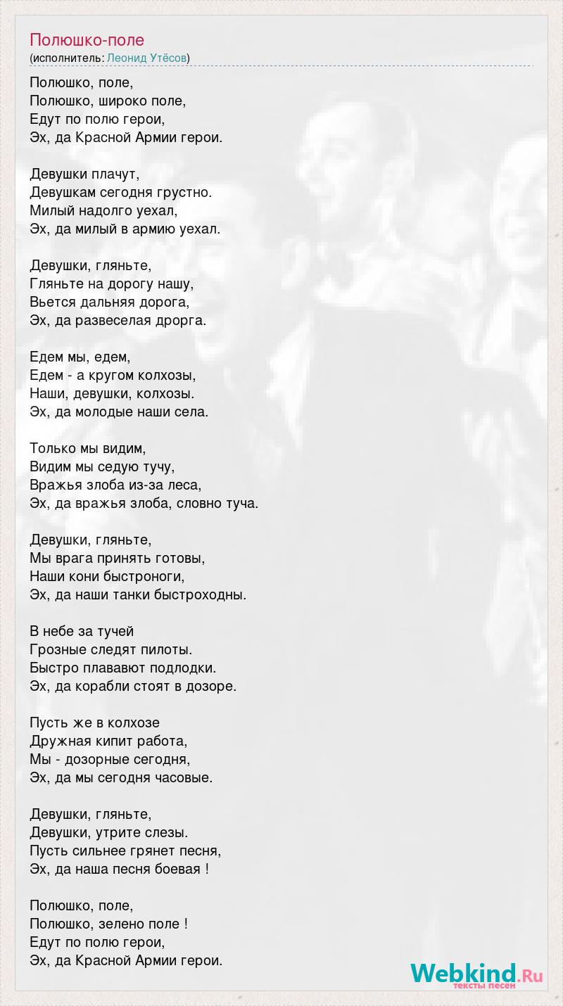 Полюшко, поле, Полюшко, широко поле, Едут по полю герои, Эх, да Красной Армии герои. Девушки плачут, Девушкам сегодня грустно. Милый надолго уехал, Эх, да милый в армию уехал. Девушки, гляньте, Гляньте на дорогу нашу, Вьется дальняя дорога, Эх, да развеселая дрорга. Едем мы, едем, Едем - а кругом колхозы, Наши, девушки, колхозы. Эх, да молодые наши села. Только мы видим, Видим мы седую тучу, Вражья злоба из-за леса, Эх, да вражья злоба, словно туча. Девушки, гляньте, Мы врага принять готовы, Наши кони быстроноги, Эх, да наши танки быстроходны. В небе за тучей Грозные следят пилоты. Быстро плававют подлодки. Эх, да корабли стоят в дозоре. Пусть же в колхозе Дружная кипит работа, Мы - дозорные сегодня, Эх, да мы сегодня часовые. Девушки, гляньте, Девушки, утрите слезы. Пусть сильнее грянет песня, Эх, да наша песня боевая ! Полюшко, поле, Полюшко, зелено поле ! Едут по полю герои, Эх, да Красной Армии герои.