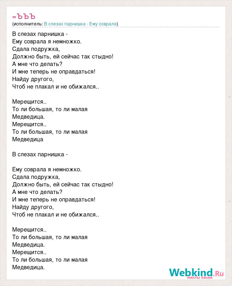 В слезах парнишка - Ему соврала я немножко. Сдала подружка, Должно быть, ей сейчас так стыдно! А мне что делать? И мне теперь не оправдаться! Найду другого, Чтоб не плакал и не обижался.. Мерещится.. То ли большая, то ли малая Медведица. Мерещится.. То ли большая, то ли малая Медведица В слезах парнишка - Ему соврала я немножко. Сдала подружка, Должно быть, ей сейчас так стыдно! А мне что делать? И мне теперь не оправдаться! Найду другого, Чтоб не плакал и не обижался.. Мерещится.. То ли большая, то ли малая Медведица. Мерещится.. То ли большая, то ли малая Медведица.