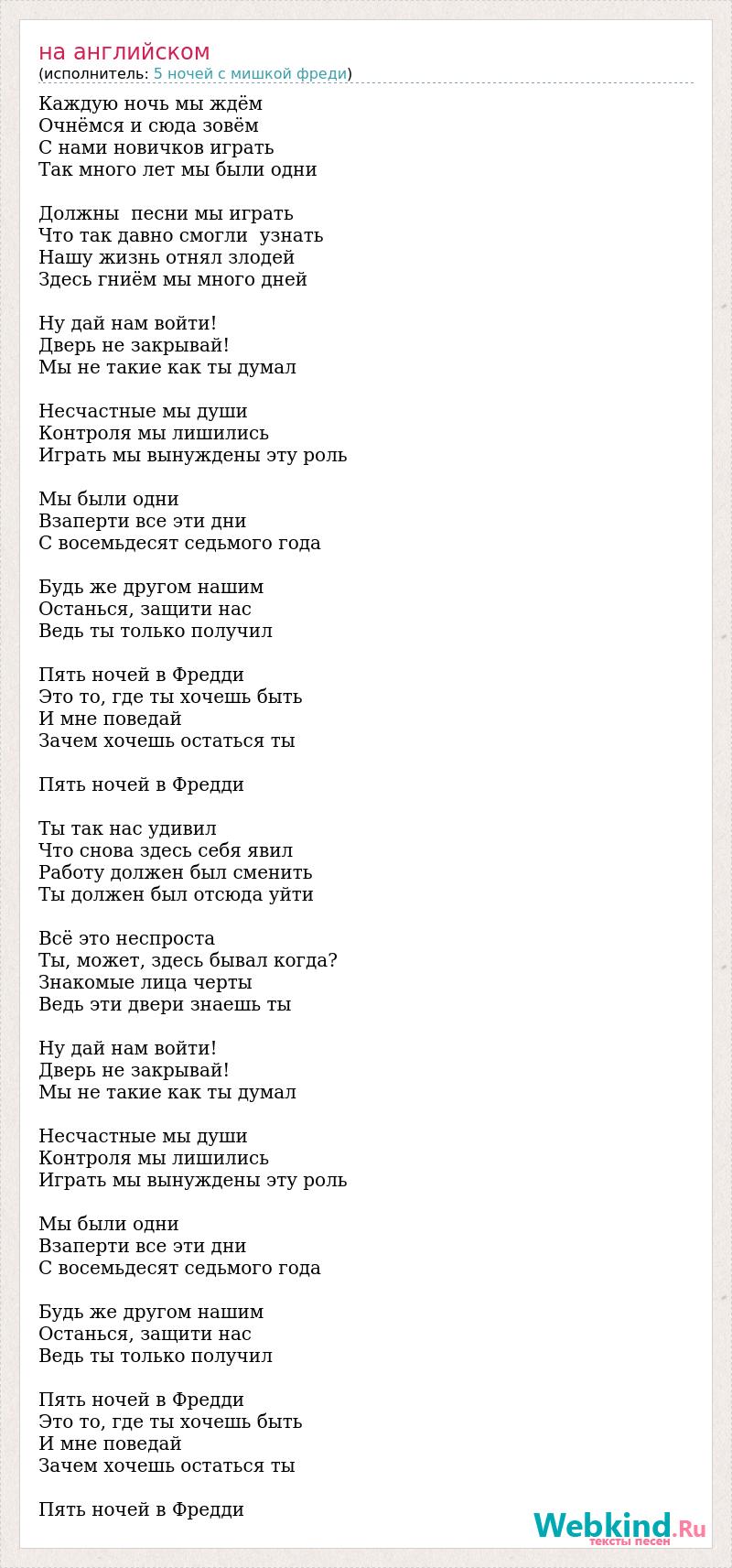 Каждую ночь мы ждём Очнёмся и сюда зовём С нами новичков играть Так много лет мы были одни Должны песни мы играть Что так давно смогли узнать Нашу жизнь отнял злодей Здесь гниём мы много дней Ну дай нам войти! Дверь не закрывай! Мы не такие как ты думал Несчастные мы души Контроля мы лишились Играть мы вынуждены эту роль Мы были одни Взаперти все эти дни С восемьдесят седьмого года Будь же другом нашим Останься, защити нас Ведь ты только получил Пять ночей в Фредди Это то, где ты хочешь быть И мне поведай Зачем хочешь остаться ты Пять ночей в Фредди Ты так нас удивил Что снова здесь себя явил Работу должен был сменить Ты должен был отсюда уйти Всё это неспроста Ты, может, здесь бывал когда? Знакомые лица черты Ведь эти двери знаешь ты Ну дай нам войти! Дверь не закрывай! Мы не такие как ты думал Несчастные мы души Контроля мы лишились Играть мы вынуждены эту роль Мы были одни Взаперти все эти дни С восемьдесят седьмого года Будь же другом нашим Останься, защити нас Ведь ты только получил Пять ночей в Фредди Это то, где ты хочешь быть И мне поведай Зачем хочешь остаться ты Пять ночей в Фредди