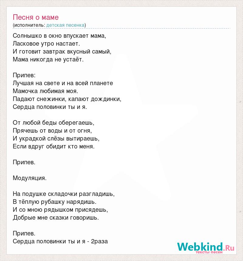Солнышко в окно впускает мама, Ласковое утро настает. И готовит завтрак вкусный самый, Мама никогда не устаёт. Припев: Лучшая на свете и на всей планете Мамочка любимая моя. Падают снежинки, капают дождинки, Сердца половинки ты и я. От любой беды оберегаешь, Прячешь от воды и от огня, И украдкой слёзы вытираешь, Если вдруг обидит кто меня. Припев. Модуляция. На подушке складочки разгладишь, В тёплую рубашку нарядишь. И со мною рядышком присядешь, Добрые мне сказки говоришь. Припев. Сердца половинки ты и я - 2раза