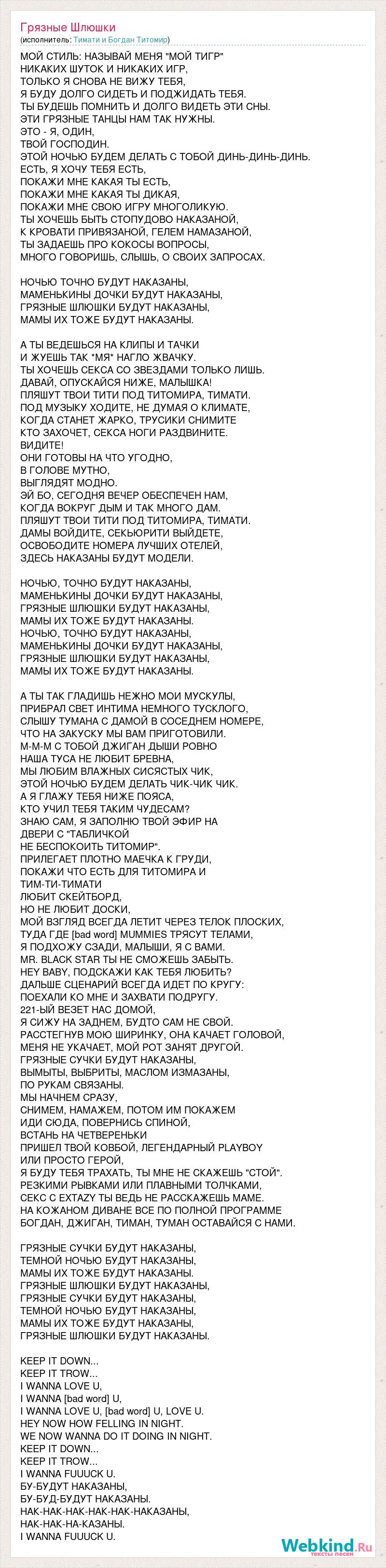 МОЙ СТИЛЬ: НАЗЫВАЙ МЕНЯ "МОЙ ТИГР" НИКАКИХ ШУТОК И НИКАКИХ ИГР, ТОЛЬКО Я СНОВА НЕ ВИЖУ ТЕБЯ, Я БУДУ ДОЛГО СИДЕТЬ И ПОДЖИДАТЬ ТЕБЯ. ТЫ БУДЕШЬ ПОМНИТЬ И ДОЛГО ВИДЕТЬ ЭТИ СНЫ. ЭТИ ГРЯЗНЫЕ ТАНЦЫ НАМ ТАК НУЖНЫ. ЭТО - Я, ОДИН, ТВОЙ ГОСПОДИН. ЭТОЙ НОЧЬЮ БУДЕМ ДЕЛАТЬ С ТОБОЙ ДИНЬ-ДИНЬ-ДИНЬ. ЕСТЬ, Я ХОЧУ ТЕБЯ ЕСТЬ, ПОКАЖИ МНЕ КАКАЯ ТЫ ЕСТЬ, ПОКАЖИ МНЕ КАКАЯ ТЫ ДИКАЯ, ПОКАЖИ МНЕ СВОЮ ИГРУ МНОГОЛИКУЮ. ТЫ ХОЧЕШЬ БЫТЬ СТОПУДОВО НАКАЗАНОЙ, К КРОВАТИ ПРИВЯЗАНОЙ, ГЕЛЕМ НАМАЗАНОЙ, ТЫ ЗАДАЕШЬ ПРО КОКОСЫ ВОПРОСЫ, МНОГО ГОВОРИШЬ, СЛЫШЬ, О СВОИХ ЗАПРОСАХ. НОЧЬЮ ТОЧНО БУДУТ НАКАЗАНЫ, МАМЕНЬКИНЫ ДОЧКИ БУДУТ НАКАЗАНЫ, ГРЯЗНЫЕ ШЛЮШКИ БУДУТ НАКАЗАНЫ, МАМЫ ИХ ТОЖЕ БУДУТ НАКАЗАНЫ. А ТЫ ВЕДЕШЬСЯ НА КЛИПЫ И ТАЧКИ И ЖУЕШЬ ТАК *МЯ* НАГЛО ЖВАЧКУ. ТЫ ХОЧЕШЬ СЕКСА СО ЗВЕЗДАМИ ТОЛЬКО ЛИШЬ. ДАВАЙ, ОПУСКАЙСЯ НИЖЕ, МАЛЫШКА! ПЛЯШУТ ТВОИ ТИТИ ПОД ТИТОМИРА, ТИМАТИ. ПОД МУЗЫКУ ХОДИТЕ, НЕ ДУМАЯ О КЛИМАТЕ, КОГДА СТАНЕТ ЖАРКО, ТРУСИКИ СНИМИТЕ КТО ЗАХОЧЕТ, СЕКСА НОГИ РАЗДВИНИТЕ. ВИДИТЕ! ОНИ ГОТОВЫ НА ЧТО УГОДНО, В ГОЛОВЕ МУТНО, ВЫГЛЯДЯТ МОДНО. ЭЙ БО, СЕГОДНЯ ВЕЧЕР ОБЕСПЕЧЕН НАМ, КОГДА ВОКРУГ ДЫМ И ТАК МНОГО ДАМ. ПЛЯШУТ ТВОИ ТИТИ ПОД ТИТОМИРА, ТИМАТИ. ДАМЫ ВОЙДИТЕ, СЕКЬЮРИТИ ВЫЙДЕТЕ, ОСВОБОДИТЕ НОМЕРА ЛУЧШИХ ОТЕЛЕЙ, ЗДЕСЬ НАКАЗАНЫ БУДУТ МОДЕЛИ. НОЧЬЮ, ТОЧНО БУДУТ НАКАЗАНЫ, МАМЕНЬКИНЫ ДОЧКИ БУДУТ НАКАЗАНЫ, ГРЯЗНЫЕ ШЛЮШКИ БУДУТ НАКАЗАНЫ, МАМЫ ИХ ТОЖЕ БУДУТ НАКАЗАНЫ. НОЧЬЮ, ТОЧНО БУДУТ НАКАЗАНЫ, МАМЕНЬКИНЫ ДОЧКИ БУДУТ НАКАЗАНЫ, ГРЯЗНЫЕ ШЛЮШКИ БУДУТ НАКАЗАНЫ, МАМЫ ИХ ТОЖЕ БУДУТ НАКАЗАНЫ. А ТЫ ТАК ГЛАДИШЬ НЕЖНО МОИ МУСКУЛЫ, ПРИБРАЛ СВЕТ ИНТИМА НЕМНОГО ТУСКЛОГО, СЛЫШУ ТУМАНА С ДАМОЙ В СОСЕДНЕМ НОМЕРЕ, ЧТО НА ЗАКУСКУ МЫ ВАМ ПРИГОТОВИЛИ. М-М-М С ТОБОЙ ДЖИГАН ДЫШИ РОВНО НАША ТУСА НЕ ЛЮБИТ БРЕВНА, МЫ ЛЮБИМ ВЛАЖНЫХ СИСЯСТЫХ ЧИК, ЭТОЙ НОЧЬЮ БУДЕМ ДЕЛАТЬ ЧИК-ЧИК ЧИК. А Я ГЛАЖУ ТЕБЯ НИЖЕ ПОЯСА, КТО УЧИЛ ТЕБЯ ТАКИМ ЧУДЕСАМ? ЗНАЮ САМ, Я ЗАПОЛНЮ ТВОЙ ЭФИР НА ДВЕРИ С "ТАБЛИЧКОЙ НЕ БЕСПОКОИТЬ ТИТОМИР". ПРИЛЕГАЕТ ПЛОТНО МАЕЧКА К ГРУДИ, ПОКАЖИ ЧТО ЕСТЬ ДЛЯ ТИТОМИРА И ТИМ-ТИ-ТИМАТИ ЛЮБИТ СКЕЙТБОРД, НО НЕ ЛЮБИТ ДОСКИ, МОЙ ВЗГЛЯД ВСЕГДА ЛЕТИТ ЧЕРЕЗ ТЕЛОК ПЛОСКИХ, ТУДА ГДЕ [bad word] MUMMIES ТРЯСУТ ТЕЛАМИ, Я ПОДХОЖУ СЗАДИ, МАЛЫШИ, Я С ВАМИ. MR. BLACK STAR ТЫ НЕ СМОЖЕШЬ ЗАБЫТЬ. HEY BABY, ПОДСКАЖИ КАК ТЕБЯ ЛЮБИТЬ? ДАЛЬШЕ СЦЕНАРИЙ ВСЕГДА ИДЕТ ПО КРУГУ: ПОЕХАЛИ КО МНЕ И ЗАХВАТИ ПОДРУГУ. 221-ЫЙ ВЕЗЕТ НАС ДОМОЙ, Я СИЖУ НА ЗАДНЕМ, БУДТО САМ НЕ СВОЙ. РАССТЕГНУВ МОЮ ШИРИНКУ, ОНА КАЧАЕТ ГОЛОВОЙ, МЕНЯ НЕ УКАЧАЕТ, МОЙ РОТ ЗАНЯТ ДРУГОЙ. ГРЯЗНЫЕ СУЧКИ БУДУТ НАКАЗАНЫ, ВЫМЫТЫ, ВЫБРИТЫ, МАСЛОМ ИЗМАЗАНЫ, ПО РУКАМ СВЯЗАНЫ. МЫ НАЧНЕМ СРАЗУ, СНИМЕМ, НАМАЖЕМ, ПОТОМ ИМ ПОКАЖЕМ ИДИ СЮДА, ПОВЕРНИСЬ СПИНОЙ, ВСТАНЬ НА ЧЕТВЕРЕНЬКИ ПРИШЕЛ ТВОЙ КОВБОЙ, ЛЕГЕНДАРНЫЙ PLAYBOY ИЛИ ПРОСТО ГЕРОЙ, Я БУДУ ТЕБЯ ТРАХАТЬ, ТЫ МНЕ НЕ СКАЖЕШЬ "СТОЙ". РЕЗКИМИ РЫВКАМИ ИЛИ ПЛАВНЫМИ ТОЛЧКАМИ, СЕКС С EXTAZY ТЫ ВЕДЬ НЕ РАССКАЖЕШЬ МАМЕ. НА КОЖАНОМ ДИВАНЕ ВСЕ ПО ПОЛНОЙ ПРОГРАММЕ БОГДАН, ДЖИГАН, ТИМАН, ТУМАН ОСТАВАЙСЯ С НАМИ. ГРЯЗНЫЕ СУЧКИ БУДУТ НАКАЗАНЫ, ТЕМНОЙ НОЧЬЮ БУДУТ НАКАЗАНЫ, МАМЫ ИХ ТОЖЕ БУДУТ НАКАЗАНЫ. ГРЯЗНЫЕ ШЛЮШКИ БУДУТ НАКАЗАНЫ, ГРЯЗНЫЕ СУЧКИ БУДУТ НАКАЗАНЫ, ТЕМНОЙ НОЧЬЮ БУДУТ НАКАЗАНЫ, МАМЫ ИХ ТОЖЕ БУДУТ НАКАЗАНЫ, ГРЯЗНЫЕ ШЛЮШКИ БУДУТ НАКАЗАНЫ. KEEP IT DOWN... KEEP IT TROW... I WANNA LOVE U, I WANNA [bad word] U, I WANNA LOVE U, [bad word] U, LOVE U. HEY NOW HOW FELLING IN NIGHT. WE NOW WANNA DO IT DOING IN NIGHT. KEEP IT DOWN... KEEP IT TROW... I WANNA FUUUCK U. БУ-БУДУТ НАКАЗАНЫ, БУ-БУД-БУДУТ НАКАЗАНЫ. НАК-НАК-НАК-НАК-НАК-НАКАЗАНЫ, НАК-НАК-НА-КАЗАНЫ. I WANNA FUUUCK U.
