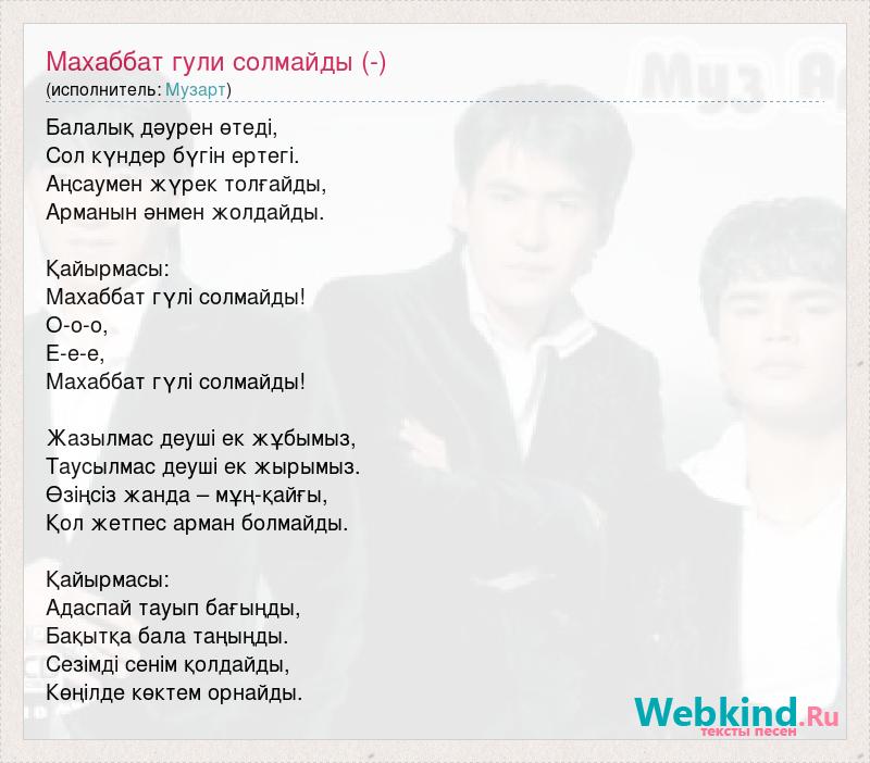 Балалық дәурен өтеді, Сол күндер бүгін ертегі. Аңсаумен жүрек толғайды, Арманын әнмен жолдайды. Қайырмасы: Махаббат гүлі солмайды! О-о-о, Е-е-е, Махаббат гүлі солмайды! Жазылмас деуші ек жұбымыз, Таусылмас деуші ек жырымыз. Өзіңсіз жанда – мұң-қайғы, Қол жетпес арман болмайды. Қайырмасы: Адаспай тауып бағыңды, Бақытқа бала таңыңды. Сезімді сенім қолдайды, Көңілде көктем орнайды.