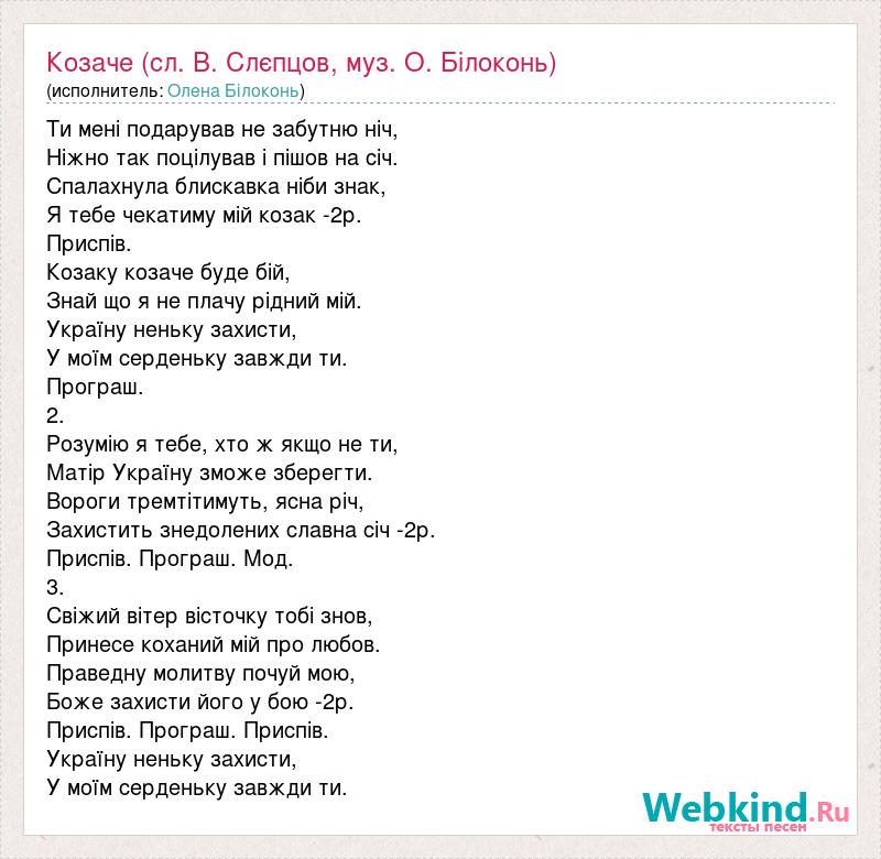 Ти мені подарував не забутню ніч, Ніжно так поцілував і пішов на січ. Спалахнула блискавка ніби знак, Я тебе чекатиму мій козак -2р. Приспів. Козаку козаче буде бій, Знай що я не плачу рідний мій. Україну неньку захисти, У моїм серденьку завжди ти. Програш. 2. Розумію я тебе, хто ж якщо не ти, Матір Україну зможе зберегти. Вороги тремтітимуть, ясна річ, Захистить знедолених славна січ -2р. Приспів. Програш. Мод. 3. Свіжий вітер вісточку тобі знов, Принесе коханий мій про любов. Праведну молитву почуй мою, Боже захисти його у бою -2р. Приспів. Програш. Приспів. Україну неньку захисти, У моїм серденьку завжди ти.
