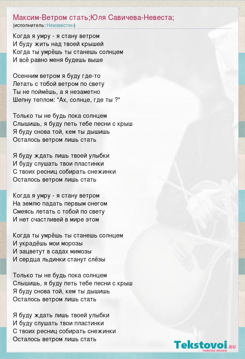 Когда я умру - я стану ветром И буду жить над твоей крышей Когда ты умрёшь ты станешь солнцем И всё равно меня будешь выше Осенним ветром я буду где-то Летать с тобой ветром по свету Ты не поймёшь, а я незаметно Шепну теплом: "Ах, солнце, где ты ?" Только ты не будь пока солнцем Слышишь, я буду петь тебе песни с крыш Я буду снова той, кем ты дышишь Осталось ветром лишь стать Я буду ждать лишь твоей улыбки И буду слушать твои пластинки С твоих ресниц собирать снежинки Осталось ветром лишь стать Когда я умру - я стану ветром На землю падать первым снегом Смеясь летать с тобой по свету И нет счастливей в мире этом Когда ты умрёшь ты станешь солнцем И украдёшь мои морозы И зацветут в садах мимозы И сердца льдинки станут слёзы Только ты не будь пока солнцем Слышишь, я буду петь тебе песни с крыш Я буду снова той, кем ты дышишь Осталось ветром лишь стать Я буду ждать лишь твоей улыбки И буду слушать твои пластинки С твоих ресниц собирать снежинки Осталось ветром лишь стать