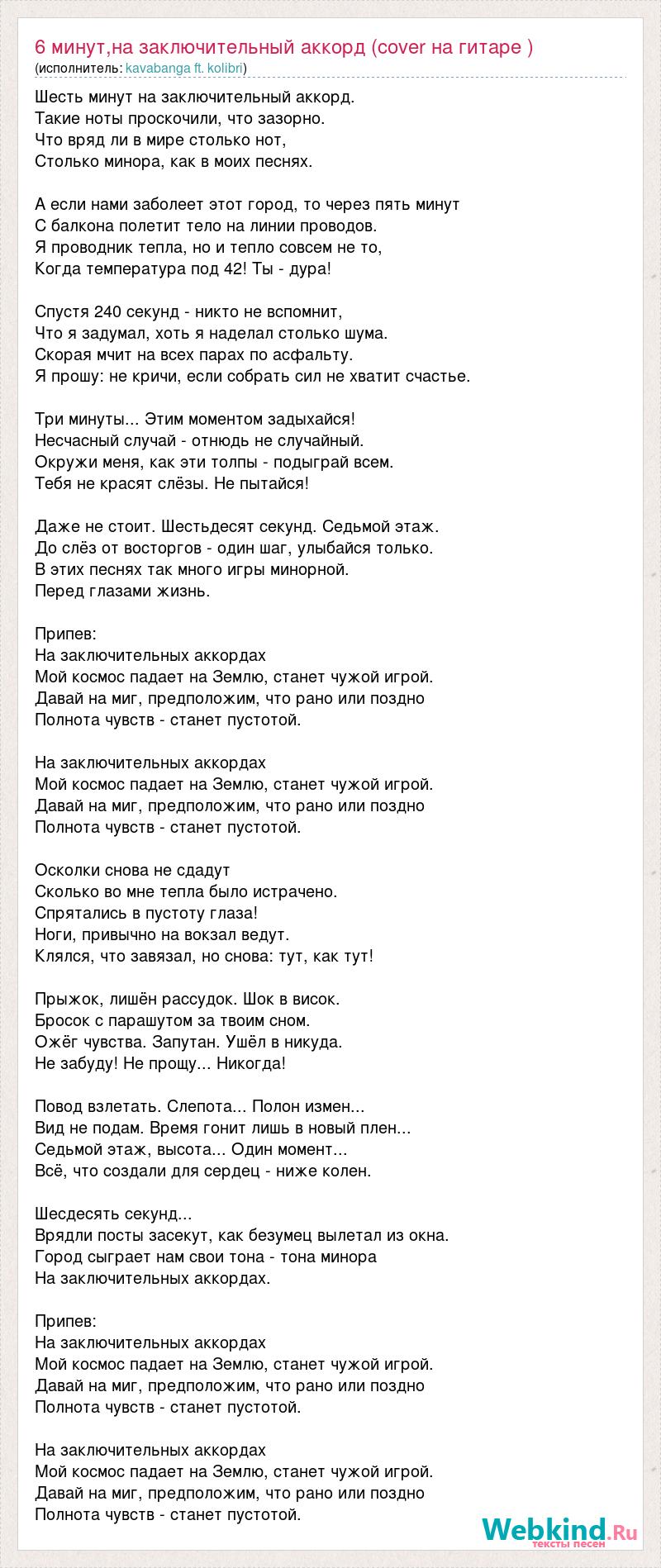 Шесть минут на заключительный аккорд. Такие ноты проскочили, что зазорно. Что вряд ли в мире столько нот, Столько минора, как в моих песнях. А если нами заболеет этот город, то через пять минут С балкона полетит тело на линии проводов. Я проводник тепла, но и тепло совсем не то, Когда температура под 42! Ты - дура! Спустя 240 секунд - никто не вспомнит, Что я задумал, хоть я наделал столько шума. Скорая мчит на всех парах по асфальту. Я прошу: не кричи, если собрать сил не хватит счастье. Три минуты... Этим моментом задыхайся! Несчасный случай - отнюдь не случайный. Окружи меня, как эти толпы - подыграй всем. Тебя не красят слёзы. Не пытайся! Даже не стоит. Шестьдесят секунд. Седьмой этаж. До слёз от восторгов - один шаг, улыбайся только. В этих песнях так много игры минорной. Перед глазами жизнь. Припев: На заключительных аккордах Мой космос падает на Землю, станет чужой игрой. Давай на миг, предположим, что рано или поздно Полнота чувств - станет пустотой. На заключительных аккордах Мой космос падает на Землю, станет чужой игрой. Давай на миг, предположим, что рано или поздно Полнота чувств - станет пустотой. Осколки снова не сдадут Сколько во мне тепла было истрачено. Спрятались в пустоту глаза! Ноги, привычно на вокзал ведут. Клялся, что завязал, но снова: тут, как тут! Прыжок, лишён рассудок. Шок в висок. Бросок с парашутом за твоим сном. Ожёг чувства. Запутан. Ушёл в никуда. Не забуду! Не прощу... Никогда! Повод взлетать. Слепота... Полон измен... Вид не подам. Время гонит лишь в новый плен... Седьмой этаж, высота... Один момент... Всё, что создали для сердец - ниже колен. Шесдесять секунд... Врядли посты засекут, как безумец вылетал из окна. Город сыграет нам свои тона - тона минора На заключительных аккордах. Припев: На заключительных аккордах Мой космос падает на Землю, станет чужой игрой. Давай на миг, предположим, что рано или поздно Полнота чувств - станет пустотой. На заключительных аккордах Мой космос падает на Землю, станет чужой игрой. Давай на миг, предположим, что рано или поздно Полнота чувств - станет пустотой.