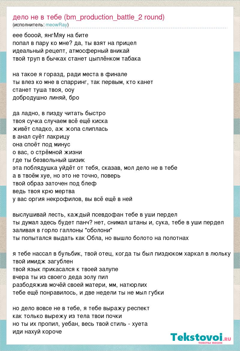 еее бооой, янгМяу на бите попал в пару ко мне? да, ты взят на прицел идеальный рецепт, атмосферный вникай твой труп в бычках станет цыплёнком табака на такое я горазд, ради места в финале ты влез ко мне в спарринг, так первым, кто канет станет туша твоя, ооу добродушно линяй, бро да ладно, в пизду читать быстро твоя сучка случаем всё ещё киска живёт сладко, аж жопа слиплась в анал суёт лакрицу она споёт под минус о вас, о стрёмной жизни где ты безвольный шизик эта поблядушка уйдёт от тебя, сказав, мол дело не в тебе а в твоём хуе, но это не точно, поверь твой образ заточен под блеф ведь твоя крю мертва у вас оргия некрофилов, вы всё ещё в ней выслушивай лесть, каждый псевдофан тебе в уши пердел ты думал здесь будет панч? нет, снимал штаны и, сука, тебе в уши пердел заливая в горло галлоны "оболони" ты попытался выдать как Обла, но вышло болото на полотнах я тебе нассал в бульбик, твой отец, когда ты был пиздюком харкал в люльку твой имидж загублен твой язык прикасался к твоей залупе вчера ты из своего деда золу пил разбодяжив мочёй своей матери, мм, натюрлих тебе ещё понравилось, и две недели ты не мыл губки но дело вовсе не в тебе, я тебе выражу респект как только вырежу из тела твои почки но ты их пропил, уебан, весь твой стиль - хуета иди нахуй короче