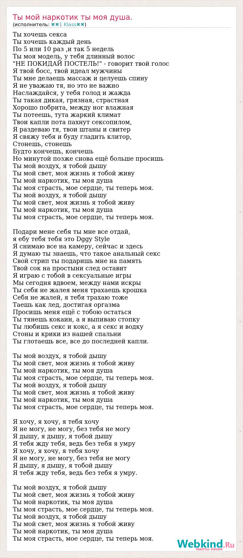 Ты хочешь секса Ты хочешь каждый день По 5 или 10 раз ,и так 5 недель Ты моя модель, у тебя длинный волос "НЕ ПОКИДАЙ ПОСТЕЛЬ!" - говорит твой голос Я твой босс, твой идеал мужчины Ты мне делаешь массаж и целуешь спину Я не уважаю тя, но это не важно Наслаждайся, у тебя голод и жажда Ты такая дикая, грязная, страстная Хорошо побрита, между ног влажная Ты потеешь, тута жаркий климат Твои капли пота пахнут сексопилом, Я раздеваю тя, твои штаны и свитер Я свяжу тебя и буду гладить клитор, Стонешь, стонешь Будто кончешь, кончешь Но минутой позже снова ещё больше просишь Ты мой воздух, я тобой дышу Ты мой свет, моя жизнь я тобой живу Ты мой наркотик, ты моя душа Ты моя страсть, мое сердце, ты теперь моя. Ты мой воздух, я тобой дышу Ты мой свет, моя жизнь я тобой живу Ты мой наркотик, ты моя душа Ты моя страсть, мое сердце, ты теперь моя. Подари мене себя ты мне все отдай, я ебу тебя тебя это Dggy Style Я снимаю все на камеру, сейчас и здесь Я думаю ты знаешь, что такое анальный секс Свой стрип ты подаришь мне на память Твой сок на простыни след оставит Я играю с тобой в сексуальные игры Мы сегодня вдвоем, между нами искры Ты себя не жалея меня трахаешь крошка Себя не жалей, я тебя трахаю тоже Таешь как лед, достигая оргазма Просишь меня ещё с тобою остаться Ты тянешь кокаин, а я выпиваю стопку Ты любишь секс и кокс, а я секс и водку Стоны и крики из нашей спальни Ты глотаешь все, все до последней капли. Ты мой воздух, я тобой дышу Ты мой свет, моя жизнь я тобой живу Ты мой наркотик, ты моя душа Ты моя страсть, мое сердце, ты теперь моя. Ты мой воздух, я тобой дышу Ты мой свет, моя жизнь я тобой живу Ты мой наркотик, ты моя душа Ты моя страсть, мое сердце, ты теперь моя. Я хочу, я хочу, я тебя хочу Я не могу, не могу, без тебя не могу Я дышу, я дышу, я тобой дышу Я тебя жду тебя, ведь без тебя я умру Я хочу, я хочу, я тебя хочу Я не могу, не могу, без тебя не могу Я дышу, я дышу, я тобой дышу Я тебя жду тебя, ведь без тебя я умру. Ты мой воздух, я тобой дышу Ты мой свет, моя жизнь я тобой живу Ты мой наркотик, ты моя душа Ты моя страсть, мое сердце, ты теперь моя. Ты мой воздух, я тобой дышу Ты мой свет, моя жизнь я тобой живу Ты мой наркотик, ты моя душа Ты моя страсть, мое сердце, ты теперь моя.