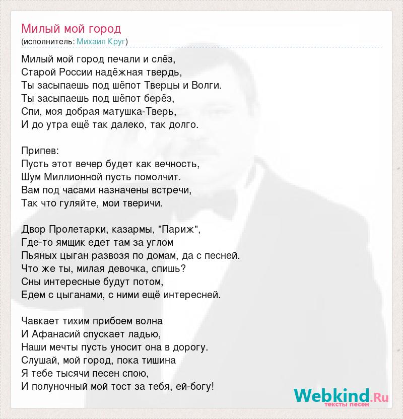 Милый мой город печали и слёз, Старой России надёжная твердь, Ты засыпаешь под шёпот Тверцы и Волги. Ты засыпаешь под шёпот берёз, Спи, моя добрая матушка-Тверь, И до утра ещё так далеко, так долго. Припев: Пусть этот вечер будет как вечность, Шум Миллионной пусть помолчит. Вам под часами назначены встречи, Так что гуляйте, мои тверичи. Двор Пролетарки, казармы, "Париж", Где-то ямщик едет там за углом Пьяных цыган развозя по домам, да с песней. Что же ты, милая девочка, спишь? Сны интересные будут потом, Едем с цыганами, с ними ещё интересней. Чавкает тихим прибоем волна И Афанасий спускает ладью, Наши мечты пусть уносит она в дорогу. Слушай, мой город, пока тишина Я тебе тысячи песен спою, И полуночный мой тост за тебя, ей-богу!