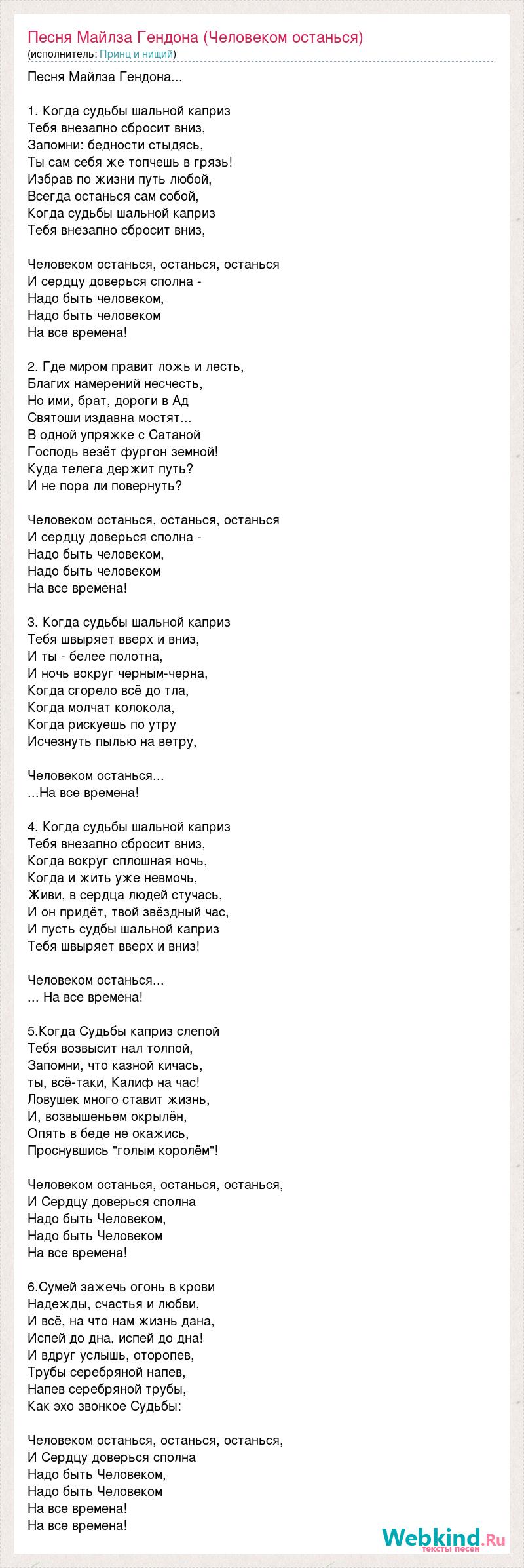 Песня Майлза Гендона... 1. Когда судьбы шальной каприз Тебя внезапно сбросит вниз, Запомни: бедности стыдясь, Ты сам себя же топчешь в грязь! Избрав по жизни путь любой, Всегда останься сам собой, Когда судьбы шальной каприз Тебя внезапно сбросит вниз, Человеком останься, останься, останься И сердцу доверься сполна - Надо быть человеком, Надо быть человеком На все времена! 2. Где миром правит ложь и лесть, Благих намерений несчесть, Но ими, брат, дороги в Ад Святоши издавна мостят... В одной упряжке с Сатаной Господь везёт фургон земной! Куда телега держит путь? И не пора ли повернуть? Человеком останься, останься, останься И сердцу доверься сполна - Надо быть человеком, Надо быть человеком На все времена! 3. Когда судьбы шальной каприз Тебя швыряет вверх и вниз, И ты - белее полотна, И ночь вокруг черным-черна, Когда сгорело всё до тла, Когда молчат колокола, Когда рискуешь по утру Исчезнуть пылью на ветру, Человеком останься... ...На все времена! 4. Когда судьбы шальной каприз Тебя внезапно сбросит вниз, Когда вокруг сплошная ночь, Когда и жить уже невмочь, Живи, в сердца людей стучась, И он придёт, твой звёздный час, И пусть судбы шальной каприз Тебя швыряет вверх и вниз! Человеком останься... ... На все времена! 5.Когда Судьбы каприз слепой Тебя возвысит нал толпой, Запомни, что казной кичась, ты, всё-таки, Калиф на час! Ловушек много ставит жизнь, И, возвышеньем окрылён, Опять в беде не окажись, Проснувшись "голым королём"! Человеком останься, останься, останься, И Сердцу доверься сполна Надо быть Человеком, Надо быть Человеком На все времена! 6.Сумей зажечь огонь в крови Надежды, счастья и любви, И всё, на что нам жизнь дана, Испей до дна, испей до дна! И вдруг услышь, оторопев, Трубы серебряной напев, Напев серебряной трубы, Как эхо звонкое Судьбы: Человеком останься, останься, останься, И Сердцу доверься сполна Надо быть Человеком, Надо быть Человеком На все времена! На все времена!