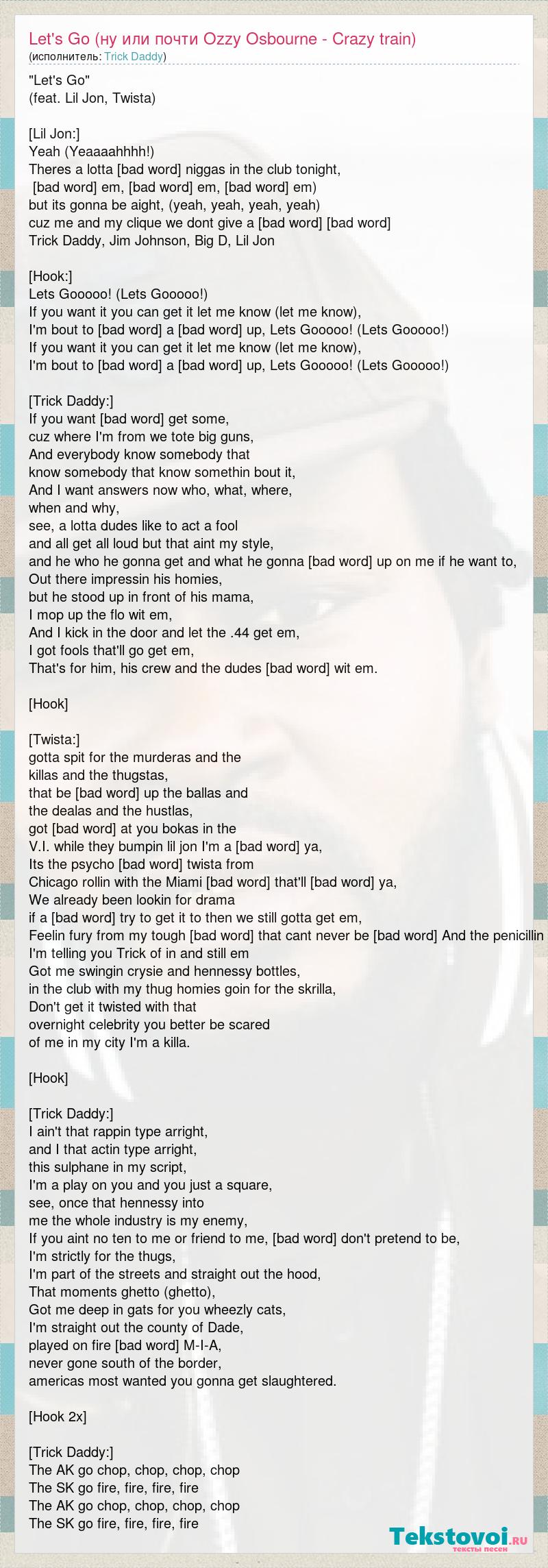 "Let's Go" (feat. Lil Jon, Twista) [Lil Jon:] Yeah (Yeaaaahhhh!) Theres a lotta [bad word] niggas in the club tonight, [bad word] em, [bad word] em, [bad word] em) but its gonna be aight, (yeah, yeah, yeah, yeah) cuz me and my clique we dont give a [bad word] [bad word] Trick Daddy, Jim Johnson, Big D, Lil Jon [Hook:] Lets Gooooo! (Lets Gooooo!) If you want it you can get it let me know (let me know), I'm bout to [bad word] a [bad word] up, Lets Gooooo! (Lets Gooooo!) If you want it you can get it let me know (let me know), I'm bout to [bad word] a [bad word] up, Lets Gooooo! (Lets Gooooo!) [Trick Daddy:] If you want some, come get some, cuz where I'm from we tote big guns, And everybody know somebody that know somebody that know somethin bout it, And I want answers now who, what, where, when and why, see, a lotta dudes like to act a fool and all get all loud but that aint my style, and he who he gonna get and what he gonna do, run up on me if he want to, Out there impressin his homies, but he stood up in front of his mama, I mop up the flo wit em, And I kick in the door and let the .44 get em, I got fools that'll go get em, That's for him, his crew and the dudes that run wit em. [Hook] [Twista:] gotta spit for the murderas and the killas and the thugstas, that be [bad word] up the ballas and the dealas and the hustlas, got me comin at you bokas in the V.I. while they bumpin lil jon I'm a brush ya, Its the psycho [bad word] twista from Chicago rollin with the Miami [bad word] that'll crush ya, We already been lookin for drama if a [bad word] try to get it to then we still gotta get em, Feelin fury from my tough [bad word] that cant never be true And the penicillin I'm telling you Trick of in and still em Got me swingin crysie and hennessy bottles, in the club with my thug homies goin for the skrilla, Don't get it twisted with that overnight celebrity you better be scared of me in my city I'm a killa. [Hook] [Trick Daddy:] I ain't that rappin type arright, and I that actin type arright, this sulphane in my script, I'm a play on you and you just a square, see, once that hennessy into me the whole industry is my enemy, If you aint no ten to me or friend to me, [bad word] don't pretend to be, I'm strictly for the thugs, I'm part of the streets and straight out the hood, That moments ghetto (ghetto), Got me deep in gats for you wheezly cats, I'm straight out the county of Dade, played on fire [bad word] M-I-A, never gone south of the border, americas most wanted you gonna get slaughtered. [Hook 2x] [Trick Daddy:] The AK go chop, chop, chop, chop The SK go fire, fire, fire, fire The AK go chop, chop, chop, chop The SK go fire, fire, fire, fire