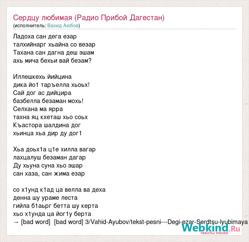 Ладоха сан дега езар талхийнарг хьайна со везар Тахана сан дагна деш эшам ахь мича бехьи вай безам? Иллешкехь йийцина дика йо1 таръелла хьоьх! Сай дог ас дийцира базбелла безаман мохь! Селхана ма ярра тахна яц кхеташ хьо соьх Къастора шалдина дог хьинца хьа дир ду дог1 Хьа доьх1а ц1е хилла вагар лахцалуш безаман дагар Ду хьуна суна хьо эшар сан хаза, сан жима езар со х1унд к1ад ца велла ва деха денна шу ураме леста гийла б1аьрг бетта шу керта хьо х1унда ца йог1у берта → [bad word] [bad word] 3/Vahid-Ayubov/tekst-pesni---Degi-ezar-Serdtsu-lyubimaya