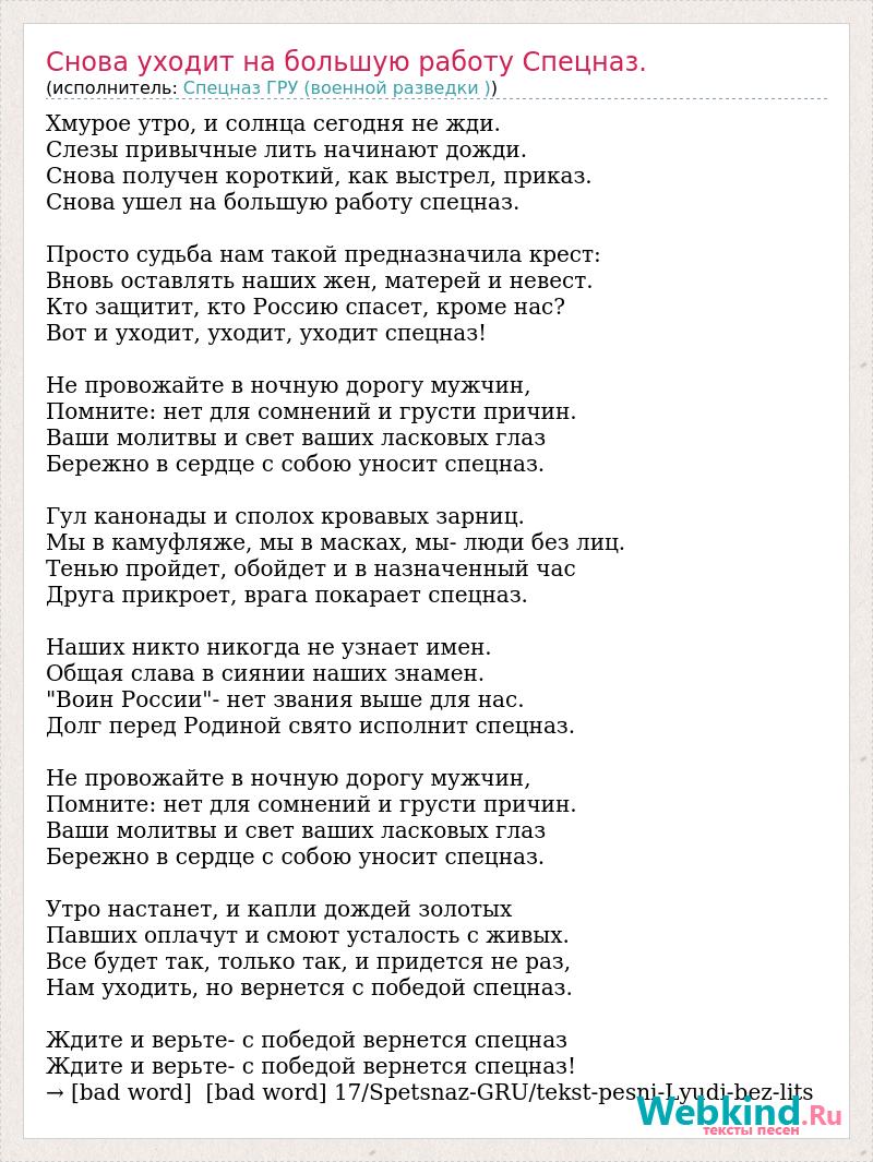 Хмурое утро, и солнца сегодня не жди. Слезы привычные лить начинают дожди. Снова получен короткий, как выстрел, приказ. Снова ушел на большую работу спецназ. Просто судьба нам такой предназначила крест: Вновь оставлять наших жен, матерей и невест. Кто защитит, кто Россию спасет, кроме нас? Вот и уходит, уходит, уходит спецназ! Не провожайте в ночную дорогу мужчин, Помните: нет для сомнений и грусти причин. Ваши молитвы и свет ваших ласковых глаз Бережно в сердце с собою уносит спецназ. Гул канонады и сполох кровавых зарниц. Мы в камуфляже, мы в масках, мы- люди без лиц. Тенью пройдет, обойдет и в назначенный час Друга прикроет, врага покарает спецназ. Наших никто никогда не узнает имен. Общая слава в сиянии наших знамен. "Воин России"- нет звания выше для нас. Долг перед Родиной свято исполнит спецназ. Не провожайте в ночную дорогу мужчин, Помните: нет для сомнений и грусти причин. Ваши молитвы и свет ваших ласковых глаз Бережно в сердце с собою уносит спецназ. Утро настанет, и капли дождей золотых Павших оплачут и смоют усталость с живых. Все будет так, только так, и придется не раз, Нам уходить, но вернется с победой спецназ. Ждите и верьте- с победой вернется спецназ Ждите и верьте- с победой вернется спецназ! → [bad word] [bad word] 17/Spetsnaz-GRU/tekst-pesni-Lyudi-bez-lits
