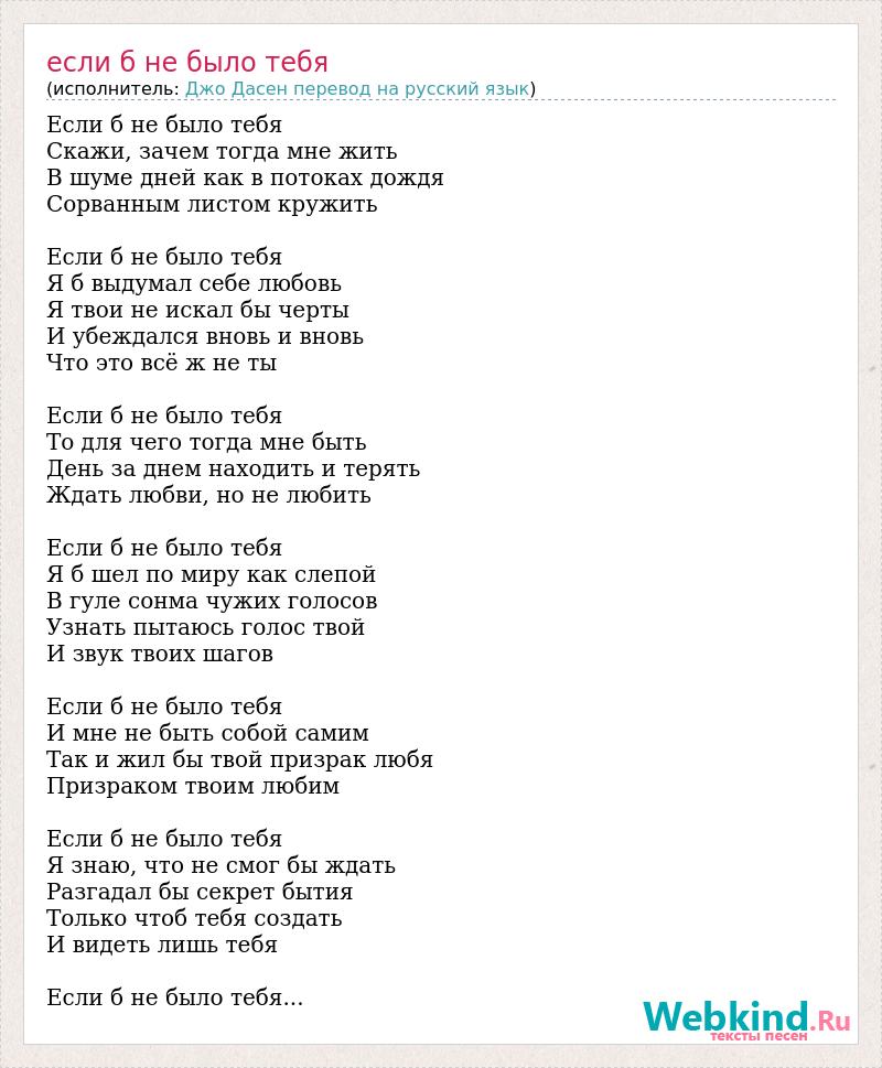 Если б не было тебя Скажи, зачем тогда мне жить В шуме дней как в потоках дождя Сорванным листом кружить Если б не было тебя Я б выдумал себе любовь Я твои не искал бы черты И убеждался вновь и вновь Что это всё ж не ты Если б не было тебя То для чего тогда мне быть День за днем находить и терять Ждать любви, но не любить Если б не было тебя Я б шел по миру как слепой В гуле сонма чужих голосов Узнать пытаюсь голос твой И звук твоих шагов Если б не было тебя И мне не быть собой самим Так и жил бы твой призрак любя Призраком твоим любим Если б не было тебя Я знаю, что не смог бы ждать Разгадал бы секрет бытия Только чтоб тебя создать И видеть лишь тебя Если б не было тебя...