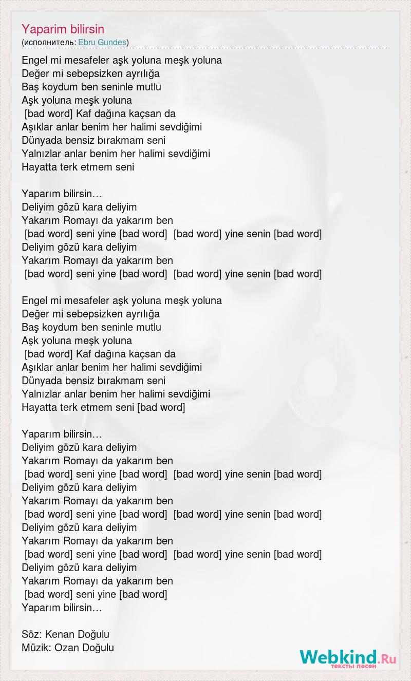 Engel mi mesafeler aşk yoluna meşk yoluna Değer mi sebepsizken ayrılığa Baş koydum ben seninle mutlu Aşk yoluna meşk yoluna [bad word] Kaf dağına kaçsan da Aşıklar anlar benim her halimi sevdiğimi Dünyada bensiz bırakmam seni Yalnızlar anlar benim her halimi sevdiğimi Hayatta terk etmem seni Yaparım bilirsin… Deliyim gözü kara deliyim Yakarım Romayı da yakarım ben [bad word] seni yine [bad word] [bad word] yine senin [bad word] Deliyim gözü kara deliyim Yakarım Romayı da yakarım ben [bad word] seni yine [bad word] [bad word] yine senin [bad word] Engel mi mesafeler aşk yoluna meşk yoluna Değer mi sebepsizken ayrılığa Baş koydum ben seninle mutlu Aşk yoluna meşk yoluna [bad word] Kaf dağına kaçsan da Aşıklar anlar benim her halimi sevdiğimi Dünyada bensiz bırakmam seni Yalnızlar anlar benim her halimi sevdiğimi Hayatta terk etmem seni [bad word] Yaparım bilirsin… Deliyim gözü kara deliyim Yakarım Romayı da yakarım ben [bad word] seni yine [bad word] [bad word] yine senin [bad word] Deliyim gözü kara deliyim Yakarım Romayı da yakarım ben [bad word] seni yine [bad word] [bad word] yine senin [bad word] Deliyim gözü kara deliyim Yakarım Romayı da yakarım ben [bad word] seni yine [bad word] [bad word] yine senin [bad word] Deliyim gözü kara deliyim Yakarım Romayı da yakarım ben [bad word] seni yine [bad word] Yaparım bilirsin… Söz: Kenan Doğulu Müzik: Ozan Doğulu