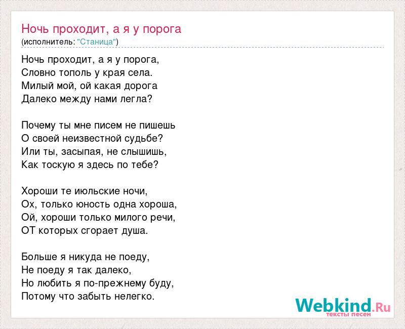 Ночь проходит, а я у порога, Словно тополь у края села. Милый мой, ой какая дорога Далеко между нами легла? Почему ты мне писем не пишешь О своей неизвестной судьбе? Или ты, засыпая, не слышишь, Как тоскую я здесь по тебе? Хороши те июльские ночи, Ох, только юность одна хороша, Ой, хороши только милого речи, ОТ которых сгорает душа. Больше я никуда не поеду, Не поеду я так далеко, Но любить я по-прежнему буду, Потому что забыть нелегко.