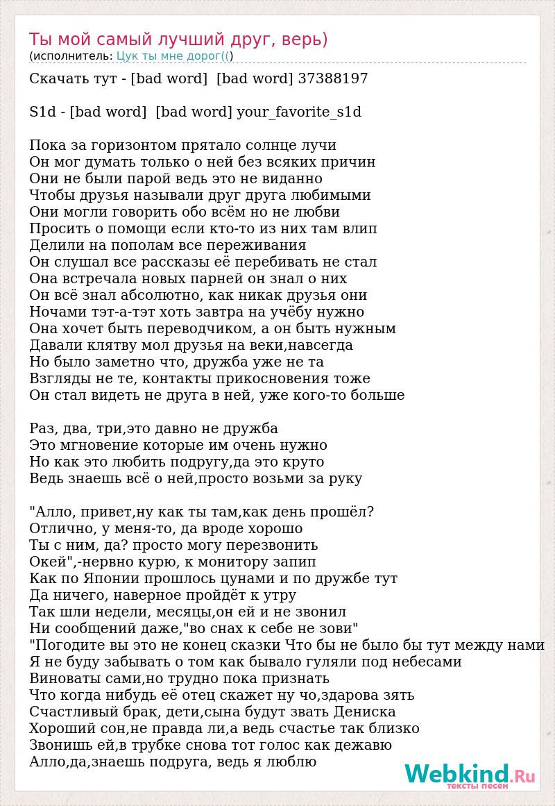 Скачать тут - [bad word] [bad word] 37388197 S1d - [bad word] [bad word] your_favorite_s1d Пока за горизонтом прятало солнце лучи Он мог думать только о ней без всяких причин Они не были парой ведь это не виданно Чтобы друзья называли друг друга любимыми Они могли говорить обо всём но не любви Просить о помощи если кто-то из них там влип Делили на пополам все переживания Он слушал все рассказы её перебивать не стал Она встречала новых парней он знал о них Он всё знал абсолютно, как никак друзья они Ночами тэт-а-тэт хоть завтра на учёбу нужно Она хочет быть переводчиком, а он быть нужным Давали клятву мол друзья на веки,навсегда Но было заметно что, дружба уже не та Взгляды не те, контакты прикосновения тоже Он стал видеть не друга в ней, уже кого-то больше Раз, два, три,это давно не дружба Это мгновение которые им очень нужно Но как это любить подругу,да это круто Ведь знаешь всё о ней,просто возьми за руку "Алло, привет,ну как ты там,как день прошёл? Отлично, у меня-то, да вроде хорошо Ты с ним, да? просто могу перезвонить Окей",-нервно курю, к монитору запип Как по Японии прошлось цунами и по дружбе тут Да ничего, наверное пройдёт к утру Так шли недели, месяцы,он ей и не звонил Ни сообщений даже,"во снах к себе не зови" "Погодите вы это не конец сказки Что бы не было бы тут между нами Я не буду забывать о том как бывало гуляли под небесами Виноваты сами,но трудно пока признать Что когда нибудь её отец скажет ну чо,здарова зять Счастливый брак, дети,сына будут звать Дениска Хороший сон,не правда ли,а ведь счастье так близко Звонишь ей,в трубке снова тот голос как дежавю Алло,да,знаешь подруга, ведь я люблю