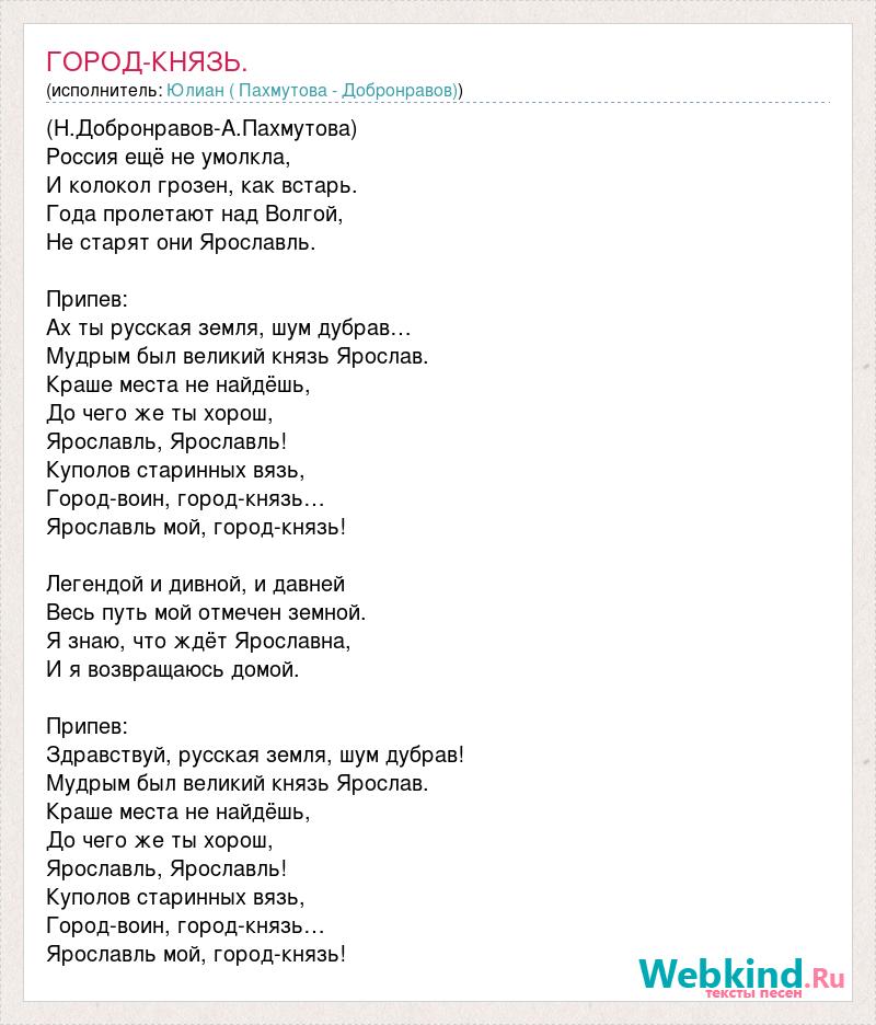 (Н.Добронравов-А.Пахмутова) Россия ещё не умолкла, И колокол грозен, как встарь. Года пролетают над Волгой, Не старят они Ярославль. Припев: Ах ты русская земля, шум дубрав… Мудрым был великий князь Ярослав. Краше места не найдёшь, До чего же ты хорош, Ярославль, Ярославль! Куполов старинных вязь, Город-воин, город-князь… Ярославль мой, город-князь! Легендой и дивной, и давней Весь путь мой отмечен земной. Я знаю, что ждёт Ярославна, И я возвращаюсь домой. Припев: Здравствуй, русская земля, шум дубрав! Мудрым был великий князь Ярослав. Краше места не найдёшь, До чего же ты хорош, Ярославль, Ярославль! Куполов старинных вязь, Город-воин, город-князь… Ярославль мой, город-князь!