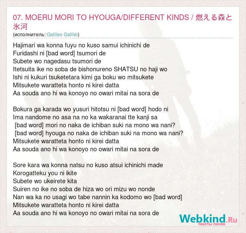 Hajimari wa konna fuyu no kuso samui ichinichi de Furidashi ni [bad word] tsumori de Subete wo nagedasu tsumori de Itetsuita ike no soba de bishonureno SHATSU no haji wo Ishi ni kukuri tsuketetara kimi ga boku wo mitsukete Mitsukete waratteta honto ni kirei datta Aa souda ano hi wa konoyo no owari mitai na sora de Bokura ga karada wo yusuri hitotsu ni [bad word] hodo ni Ima nandome no asa na no ka wakaranai tte kanji sa [bad word] mori no naka de ichiban suki na mono wa nani? [bad word] hyouga no naka de ichiban suki na mono wa nani? Mitsukete waratteta honto ni kirei datta Aa souda ano hi wa konoyo no owari mitai na sora de Sore kara wa konna natsu no kuso atsui ichinichi made Korogatteku you ni ikite Subete wo ukeirete kita Suiren no ike no soba de hiza wo ori mizu wo nonde Nan wa ka no usagi wo tabe nannin ka kodomo wo [bad word] Mitsukete waratteta honto ni kirei datta Aa souda ano hi wa konoyo no owari mitai na sora de