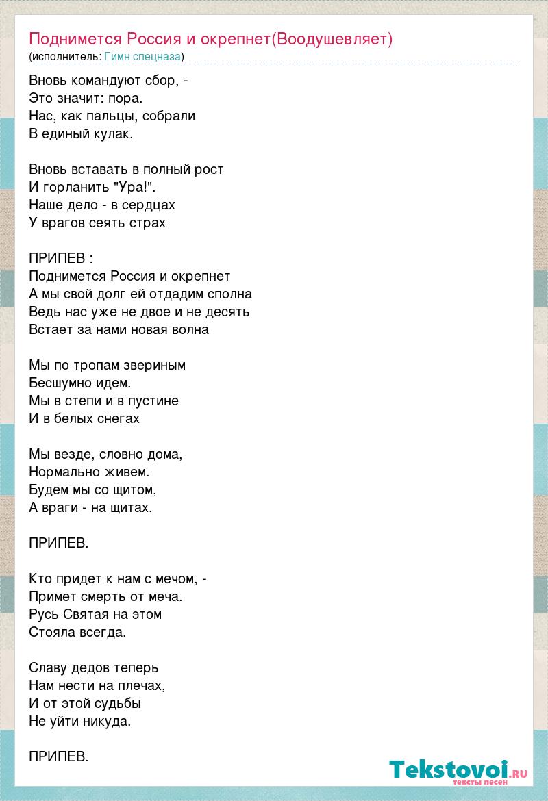 Вновь командуют сбор, - Это значит: пора. Нас, как пальцы, собрали В единый кулак. Вновь вставать в полный рост И горланить "Ура!". Наше дело - в сердцах У врагов сеять страх ПРИПЕВ : Поднимется Россия и окрепнет А мы свой долг ей отдадим сполна Ведь нас уже не двое и не десять Встает за нами новая волна Мы по тропам звериным Бесшумно идем. Мы в степи и в пустине И в белых снегах Мы везде, словно дома, Нормально живем. Будем мы со щитом, А враги - на щитах. ПРИПЕВ. Кто придет к нам с мечом, - Примет смерть от меча. Русь Святая на этом Стояла всегда. Славу дедов теперь Нам нести на плечах, И от этой судьбы Не уйти никуда. ПРИПЕВ.