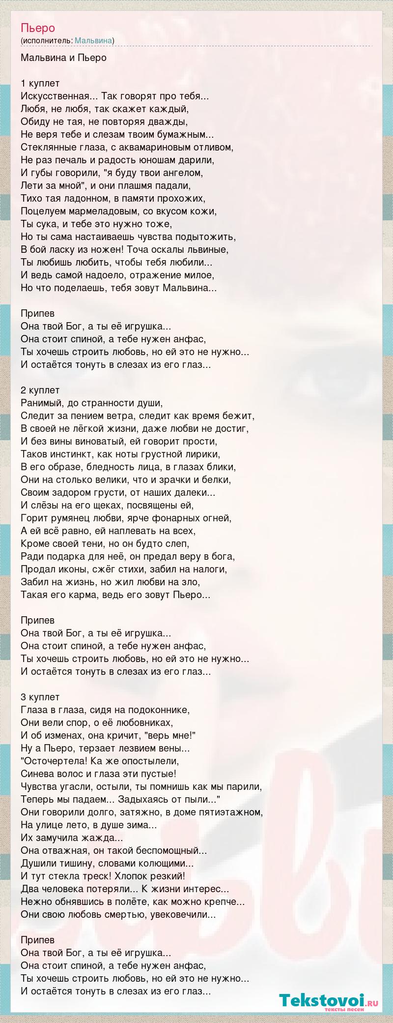 Мальвина и Пьеро 1 куплет Искусственная... Так говорят про тебя... Любя, не любя, так скажет каждый, Обиду не тая, не повторяя дважды, Не веря тебе и слезам твоим бумажным... Стеклянные глаза, с аквамариновым отливом, Не раз печаль и радость юношам дарили, И губы говорили, "я буду твои ангелом, Лети за мной", и они плашмя падали, Тихо тая ладонном, в памяти прохожих, Поцелуем мармеладовым, со вкусом кожи, Ты сука, и тебе это нужно тоже, Но ты сама настаиваешь чувства подытожить, В бой ласку из ножен! Точа оскалы львиные, Ты любишь любить, чтобы тебя любили... И ведь самой надоело, отражение милое, Но что поделаешь, тебя зовут Мальвина... Припев Она твой Бог, а ты её игрушка... Она стоит спиной, а тебе нужен анфас, Ты хочешь строить любовь, но ей это не нужно... И остаётся тонуть в слезах из его глаз... 2 куплет Ранимый, до странности души, Следит за пением ветра, следит как время бежит, В своей не лёгкой жизни, даже любви не достиг, И без вины виноватый, ей говорит прости, Таков инстинкт, как ноты грустной лирики, В его образе, бледность лица, в глазах блики, Они на столько велики, что и зрачки и белки, Своим задором грусти, от наших далеки... И слёзы на его щеках, посвящены ей, Горит румянец любви, ярче фонарных огней, А ей всё равно, ей наплевать на всех, Кроме своей тени, но он будто слеп, Ради подарка для неё, он предал веру в бога, Продал иконы, сжёг стихи, забил на налоги, Забил на жизнь, но жил любви на зло, Такая его карма, ведь его зовут Пьеро... Припев Она твой Бог, а ты её игрушка... Она стоит спиной, а тебе нужен анфас, Ты хочешь строить любовь, но ей это не нужно... И остаётся тонуть в слезах из его глаз... 3 куплет Глаза в глаза, сидя на подоконнике, Они вели спор, о её любовниках, И об изменах, она кричит, "верь мне!" Ну а Пьеро, терзает лезвием вены... "Осточертела! Ка же опостылели, Синева волос и глаза эти пустые! Чувства угасли, остыли, ты помнишь как мы парили, Теперь мы падаем... Задыхаясь от пыли..." Они говорили долго, затяжно, в доме пятиэтажном, На улице лето, в душе зима... Их замучила жажда... Она отважная, он такой беспомощный... Душили тишину, словами колющими... И тут стекла треск! Хлопок резкий! Два человека потеряли... К жизни интерес... Нежно обнявшись в полёте, как можно крепче... Они свою любовь смертью, увековечили... Припев Она твой Бог, а ты её игрушка... Она стоит спиной, а тебе нужен анфас, Ты хочешь строить любовь, но ей это не нужно... И остаётся тонуть в слезах из его глаз...