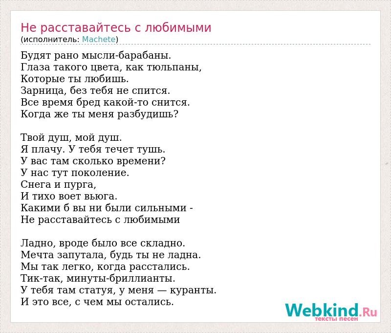 Будят рано мысли-барабаны. Глаза такого цвета, как тюльпаны, Которые ты любишь. Зарница, без тебя не спится. Все время бред какой-то снится. Когда же ты меня разбудишь? Твой душ, мой душ. Я плачу. У тебя течет тушь. У вас там сколько времени? У нас тут поколение. Снега и пурга, И тихо воет вьюга. Какими б вы ни были сильными - Не расставайтесь с любимыми Ладно, вроде было все складно. Мечта запутала, будь ты не ладна. Мы так легко, когда расстались. Тик-так, минуты-бриллианты. У тебя там статуя, у меня — куранты. И это все, с чем мы остались.