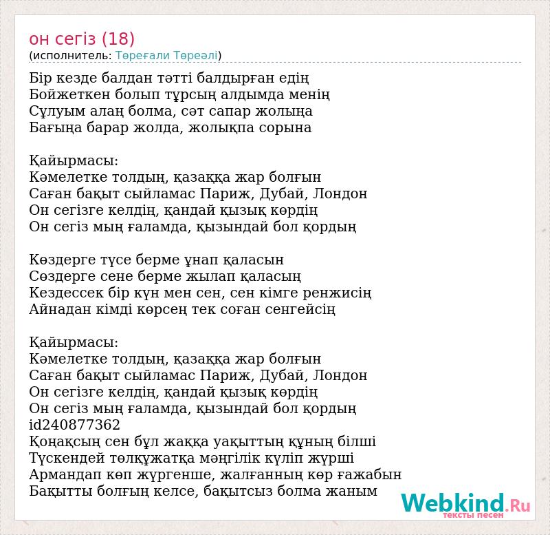 Бір кезде балдан тәтті балдырған едің Бойжеткен болып тұрсың алдымда менің Сұлуым алаң болма, сәт сапар жолыңа Бағыңа барар жолда, жолықпа сорына Қайырмасы: Кәмелетке толдың, қазаққа жар болғын Саған бақыт сыйламас Париж, Дубай, Лондон Он сегізге келдің, қандай қызық көрдің Он сегіз мың ғаламда, қызындай бол қордың Көздерге түсе берме ұнап қаласын Сөздерге сене берме жылап қаласың Кездессек бір күн мен сен, сен кімге ренжисің Айнадан кімді көрсең тек соған сенгейсің Қайырмасы: Кәмелетке толдың, қазаққа жар болғын Саған бақыт сыйламас Париж, Дубай, Лондон Он сегізге келдің, қандай қызық көрдің Он сегіз мың ғаламда, қызындай бол қордың id240877362 Қоңақсың сен бұл жаққа уақыттың құның білші Түскендей төлқұжатқа мәңгілік күліп жүрші Армандап көп жүргенше, жалғанның көр ғажабын Бақытты болғың келсе, бақытсыз болма жаным