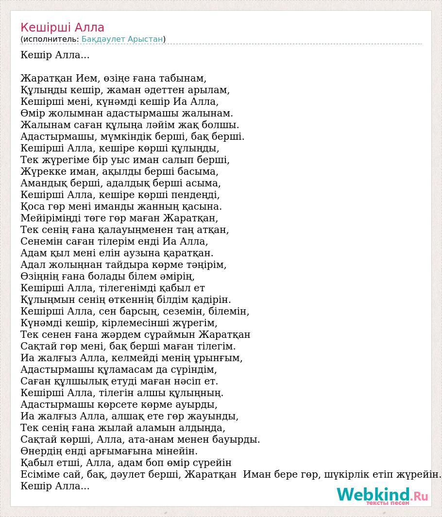Кешір Алла...💚 Жаратқан Ием, өзіңе ғана табынам, Құлыңды кешір, жаман әдеттен арылам, Кешірші мені, күнәмді кешір Иа Алла, Өмір жолымнан адастырмашы жалынам. Жалынам саған құлыңа ләйім жақ болшы. Адастырмашы, мүмкіндік берші, бақ берші. Кешірші Алла, кешіре көрші құлыңды, Тек жүрегіме бір уыс иман салып берші, Жүрекке иман, ақылды берші басыма, Амандық берші, адалдық берші асыма, Кешірші Алла, кешіре көрші пендеңді, Қоса гөр мені иманды жанның қасына. Мейіріміңді төге гөр маған Жаратқан, Тек сенің ғана қалауыңменен таң атқан, Сенемін саған тілерім енді Иа Алла, Адам қыл мені елін аузына қаратқан. Адал жолыңнан тайдыра көрме тәңірім, Өзіңнің ғана болады білем әмірің, Кешірші Алла, тілегенімді қабыл ет Құлыңмын сенің өткеннің білдім қадірін. Кешірші Алла, сен барсың, сеземін, білемін, Күнәмді кешір, кірлемесінші жүрегім, Тек сенен ғана жәрдем сұраймын Жаратқан Сақтай гөр мені, бақ берші маған тілегім. Иа жалғыз Алла, келмейді менің ұрынғым, Адастырмашы құламасам да сүріндім, Саған құлшылық етуді маған нәсіп ет. Кешірші Алла, тілегін алшы құлыңның. Адастырмашы көрсете көрме ауырды, Иа жалғыз Алла, алшақ ете гөр жауынды, Тек сенің ғана жылай аламын алдыңда, Сақтай көрші, Алла, ата-анам менен бауырды. Өнердің енді арғымағына мінейін. Қабыл етші, Алла, адам боп өмір сүрейін Есіміме сай, бақ, дәулет берші, Жаратқан Иман бере гөр, шүкірлік етіп жүрейін. Кешір Алла...