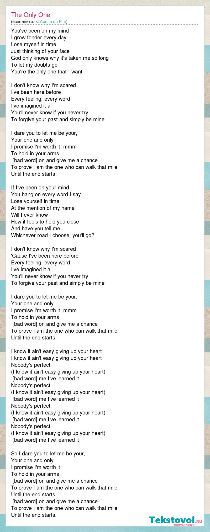 You've been on my mind I grow fonder every day Lose myself in time Just thinking of your face God only knows why it's taken me so long To let my doubts go You're the only one that I want I don't know why I'm scared I've been here before Every feeling, every word I've imagined it all You'll never know if you never try To forgive your past and simply be mine I dare you to let me be your, Your one and only I promise I'm worth it, mmm To hold in your arms [bad word] on and give me a chance To prove I am the one who can walk that mile Until the end starts If I've been on your mind You hang on every word I say Lose yourself in time At the mention of my name Will I ever know How it feels to hold you close And have you tell me Whichever road I choose, you'll go? I don't know why I'm scared 'Cause I've been here before Every feeling, every word I've imagined it all You'll never know if you never try To forgive your past and simply be mine I dare you to let me be your, Your one and only I promise I'm worth it, mmm To hold in your arms [bad word] on and give me a chance To prove I am the one who can walk that mile Until the end starts I know it ain't easy giving up your heart I know it ain't easy giving up your heart Nobody's perfect (I know it ain't easy giving up your heart) [bad word] me I've learned it Nobody's perfect (I know it ain't easy giving up your heart) [bad word] me I've learned it Nobody's perfect (I know it ain't easy giving up your heart) [bad word] me I've learned it Nobody's perfect (I know it ain't easy giving up your heart) [bad word] me I've learned it So I dare you to let me be your, Your one and only I promise I'm worth it To hold in your arms [bad word] on and give me a chance To prove I am the one who can walk that mile Until the end starts [bad word] on and give me a chance To prove I am the one who can walk that mile Until the end starts.
