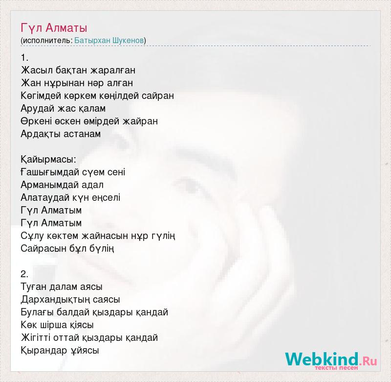 1. Жасыл бақтан жаралған Жан нұрынан нәр алған Көгімдей көркем көңілдей сайран Арудай жас қалам Өркені өскен өмірдей жайран Ардақты астанам Қайырмасы: Ғашығымдай сүем сені Арманымдай адал Алатаудай күн еңселі Гүл Алматым Гүл Алматым Сұлу көктем жайнасын нұр гүлің Сайрасын бұл бүлің 2. Туған далам аясы Дархандықтың саясы Булағы балдай қыздары қандай Көк шірша қіясы Жігітті оттай қыздары қандай Қырандар ұйясы