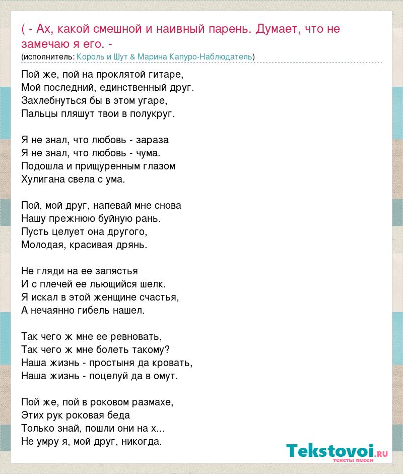 Пой же, пой на проклятой гитаре, Мой последний, единственный друг. Захлебнуться бы в этом угаре, Пальцы пляшут твои в полукруг. Я не знал, что любовь - зараза Я не знал, что любовь - чума. Подошла и прищуренным глазом Хулигана свела с ума. Пой, мой друг, напевай мне снова Нашу прежнюю буйную рань. Пусть целует она другого, Молодая, красивая дрянь. Не гляди на ее запястья И с плечей ее льющийся шелк. Я искал в этой женщине счастья, А нечаянно гибель нашел. Так чего ж мне ее ревновать, Так чего ж мне болеть такому? Наша жизнь - простыня да кровать, Наша жизнь - поцелуй да в омут. Пой же, пой в роковом размахе, Этих рук роковая беда Только знай, пошли они на х... Не умру я, мой друг, никогда.