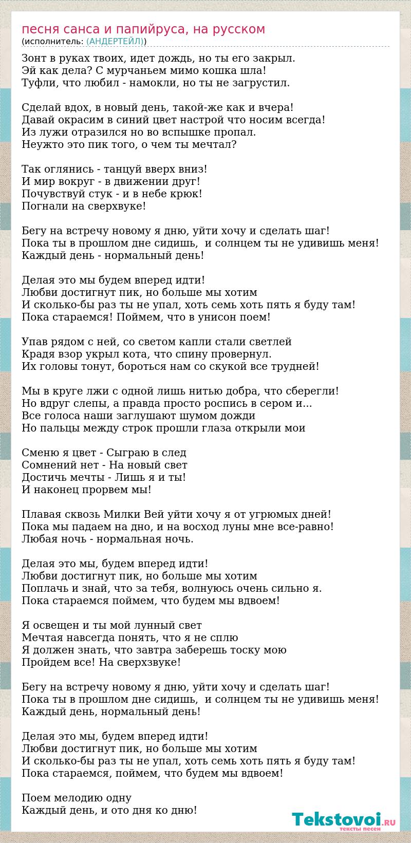 Зонт в руках твоих, идет дождь, но ты его закрыл. Эй как дела? С мурчаньем мимо кошка шла! Туфли, что любил - намокли, но ты не загрустил. Сделай вдох, в новый день, такой-же как и вчера! Давай окрасим в синий цвет настрой что носим всегда! Из лужи отразился но во вспышке пропал. Неужто это пик того, о чем ты мечтал? Так оглянись - танцуй вверх вниз! И мир вокруг - в движении друг! Почувствуй стук - и в небе крюк! Погнали на сверхвуке! Бегу на встречу новому я дню, уйти хочу и сделать шаг! Пока ты в прошлом дне сидишь, и солнцем ты не удивишь меня! Каждый день - нормальный день! Делая это мы будем вперед идти! Любви достигнут пик, но больше мы хотим И сколько-бы раз ты не упал, хоть семь хоть пять я буду там! Пока стараемся! Поймем, что в унисон поем! Упав рядом с ней, со светом капли стали светлей Крадя взор укрыл кота, что спину провернул. Их головы тонут, бороться нам со скукой все трудней! Мы в круге лжи с одной лишь нитью добра, что сберегли! Но вдруг слепы, а правда просто роспись в сером и... Все голоса наши заглушают шумом дожди Но пальцы между строк прошли глаза открыли мои Сменю я цвет - Сыграю в след Сомнений нет - На новый свет Достичь мечты - Лишь я и ты! И наконец прорвем мы! Плавая сквозь Милки Вей уйти хочу я от угрюмых дней! Пока мы падаем на дно, и на восход луны мне все-равно! Любая ночь - нормальная ночь. Делая это мы, будем вперед идти! Любви достигнут пик, но больше мы хотим Поплачь и знай, что за тебя, волнуюсь очень сильно я. Пока стараемся поймем, что будем мы вдвоем! Я освещен и ты мой лунный свет Мечтая навсегда понять, что я не сплю Я должен знать, что завтра заберешь тоску мою Пройдем все! На сверхзвуке! Бегу на встречу новому я дню, уйти хочу и сделать шаг! Пока ты в прошлом дне сидишь, и солнцем ты не удивишь меня! Каждый день, нормальный день! Делая это мы, будем вперед идти! Любви достигнут пик, но больше мы хотим И сколько-бы раз ты не упал, хоть семь хоть пять я буду там! Пока стараемся, поймем, что будем мы вдвоем! Поем мелодию одну Каждый день, и ото дня ко дню!