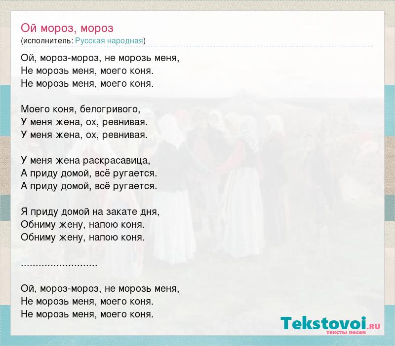 Ой, мороз-мороз, не морозь меня, Не морозь меня, моего коня. Не морозь меня, моего коня. Моего коня, белогривого, У меня жена, ох, ревнивая. У меня жена, ох, ревнивая. У меня жена раскрасавица, А приду домой, всё ругается. А приду домой, всё ругается. Я приду домой на закате дня, Обниму жену, напою коня. Обниму жену, напою коня. .......................... Ой, мороз-мороз, не морозь меня, Не морозь меня, моего коня. Не морозь меня, моего коня.