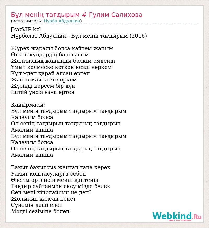 [kazVIP.kz] Нұрболат Абдуллин - Бұл менің тағдырым (2016) Жүрек жаралы болса қайтем жаным Өткен күндердің бәрі сағым Жалғыздық жаныңды бәлкім емдейді Ұмыт келмеске кеткен кезді көркем Күлімдеп қарай алсан ертен Жас алмай көзге еркем Жүзіңді көрсем бір күн Іштей үнсіз ғана өртен Қайырмасы: Бұл менің тағдырым тағдырым тағдырым Қалауым болса Ол сенің тағдырың тағдырың тағдырың Амалым қанша Бұл менің тағдырым тағдырым тағдырым Қалауым болса Ол сенің тағдырың тағдырың тағдырың Амалым қанша Бақыт бақытсыз жанған ғана керек Уақыт қоштасуларға себеп Өзегім өртенсін мейлі қайтейін Тағдыр сүйгенмен екеуімізде бөлек Сен мені кінәлайсын не деп? Жолығып қалсан кенет Сүйемін деші елеп Мәңгі сезіміне бөлеп